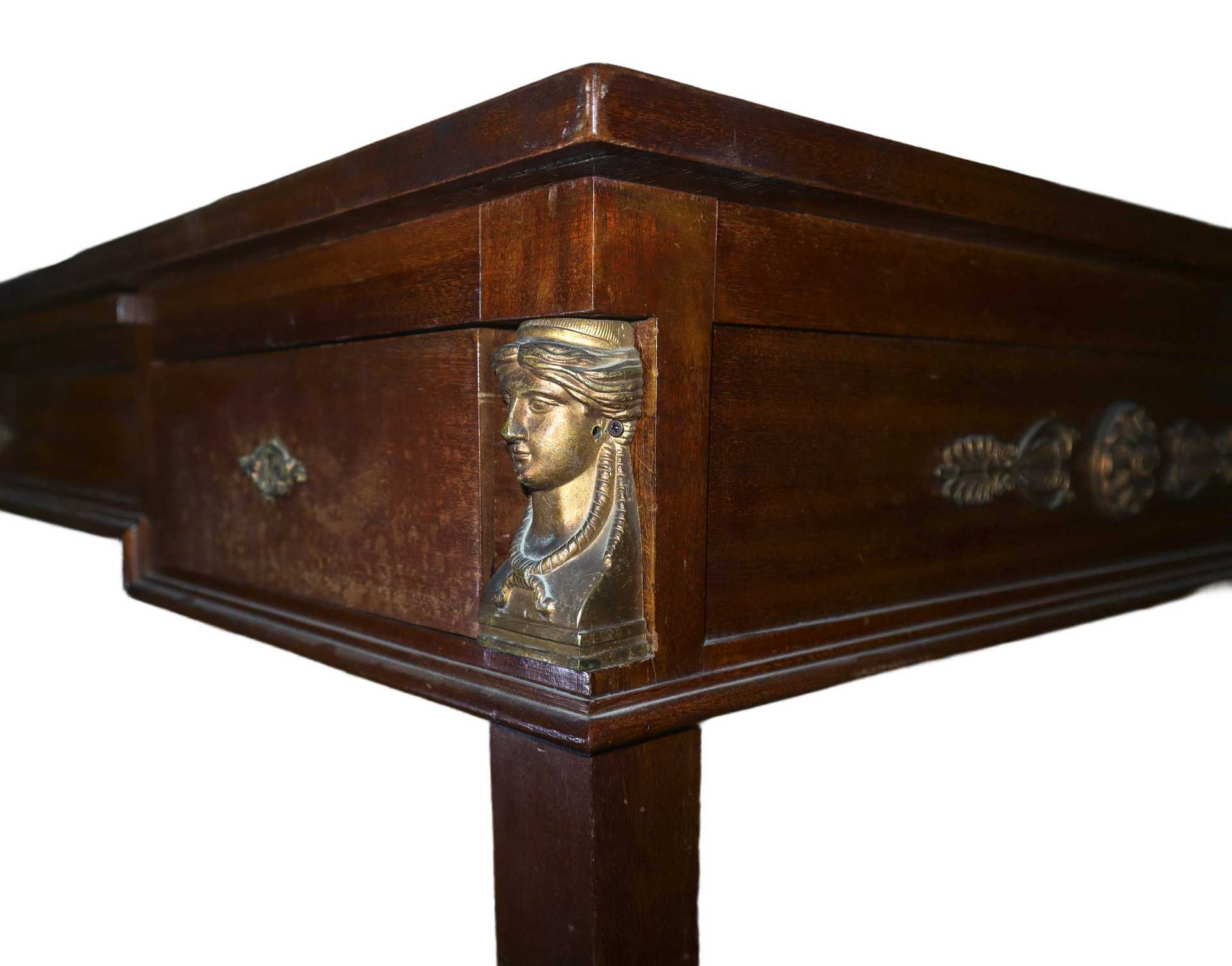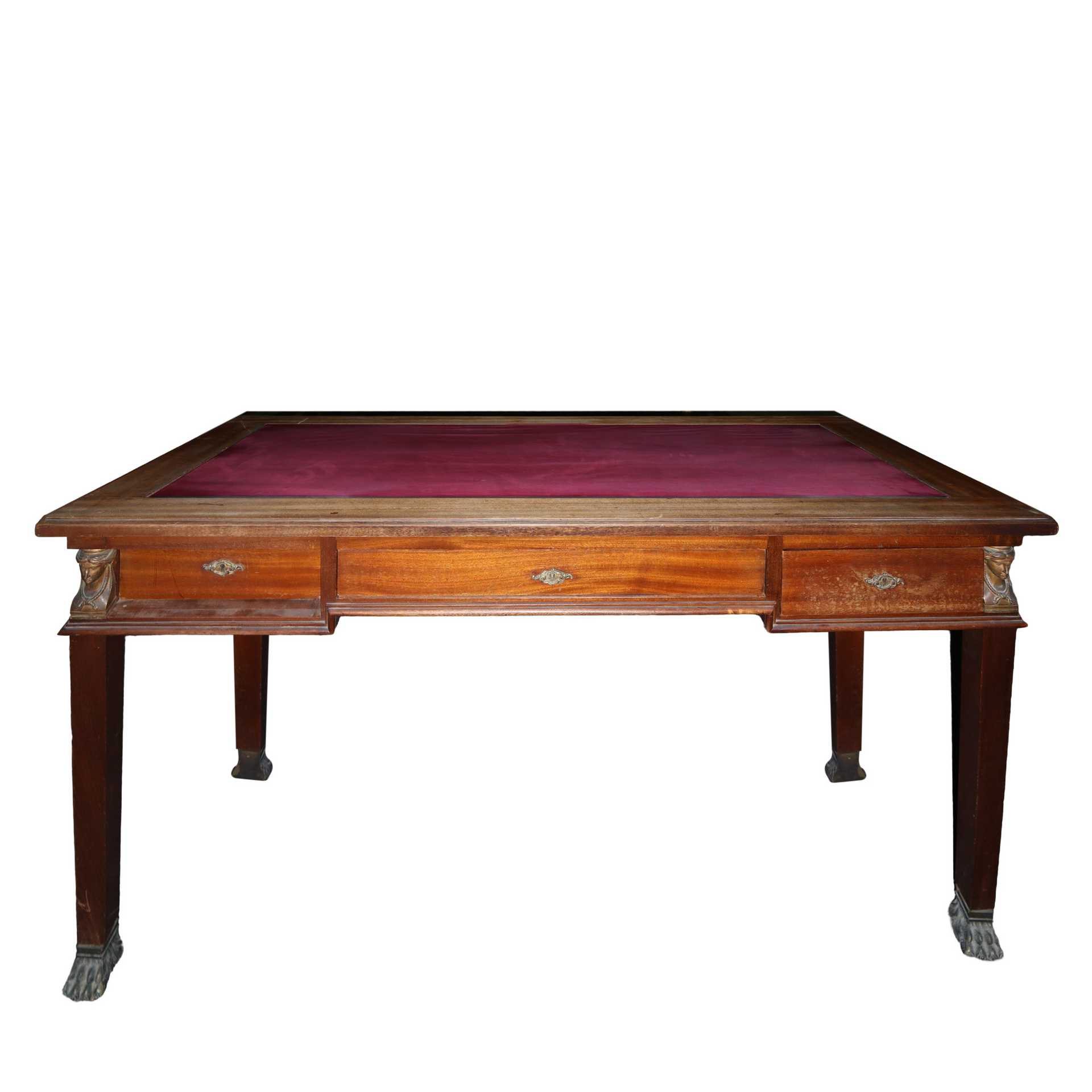 Scrittoio in legno di mogano, piano con vetro sovrapposto., France, fine Napoleon III, 19th/20° secolo. H cm 80x151 x80 Bronzi applicati. Bronzi applicati.