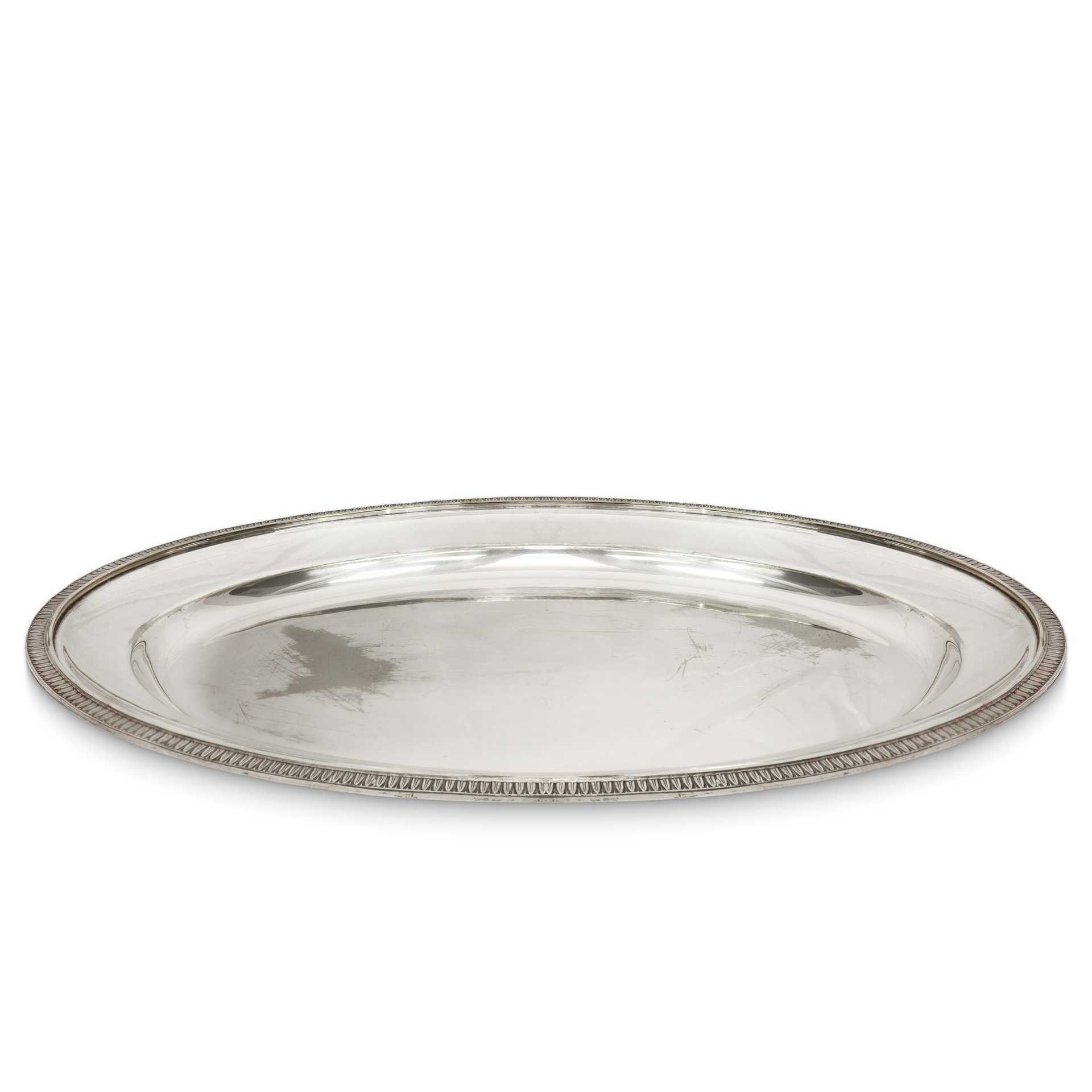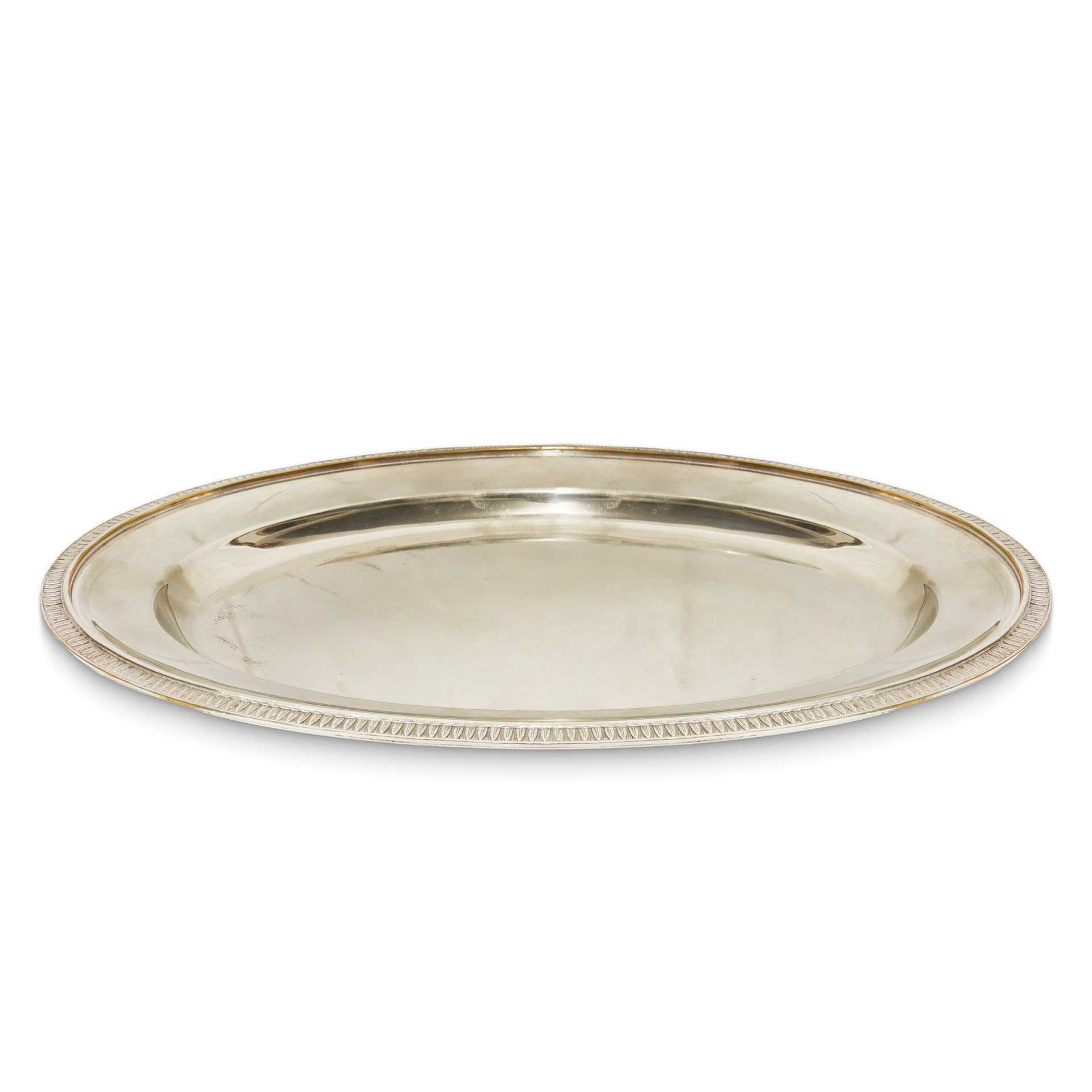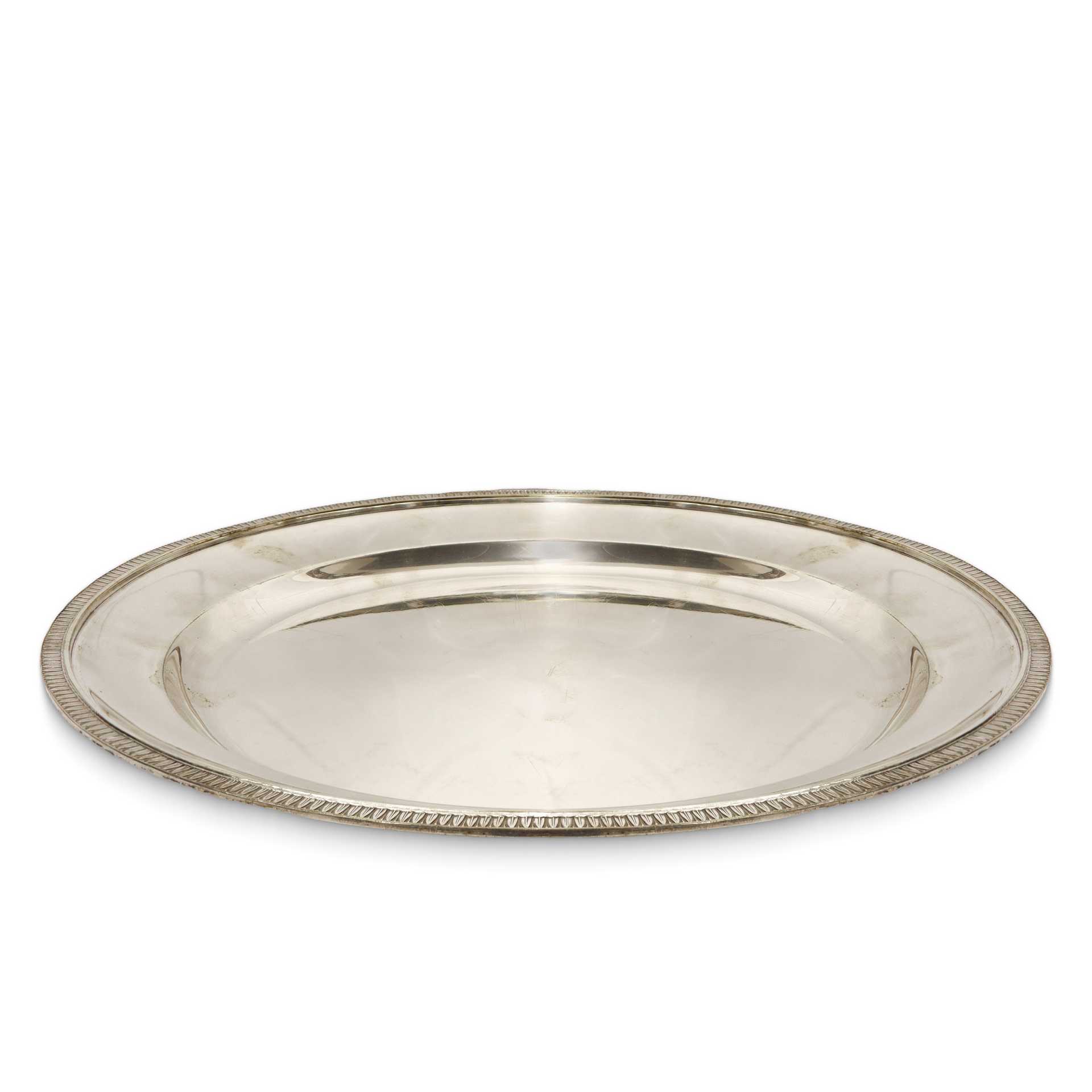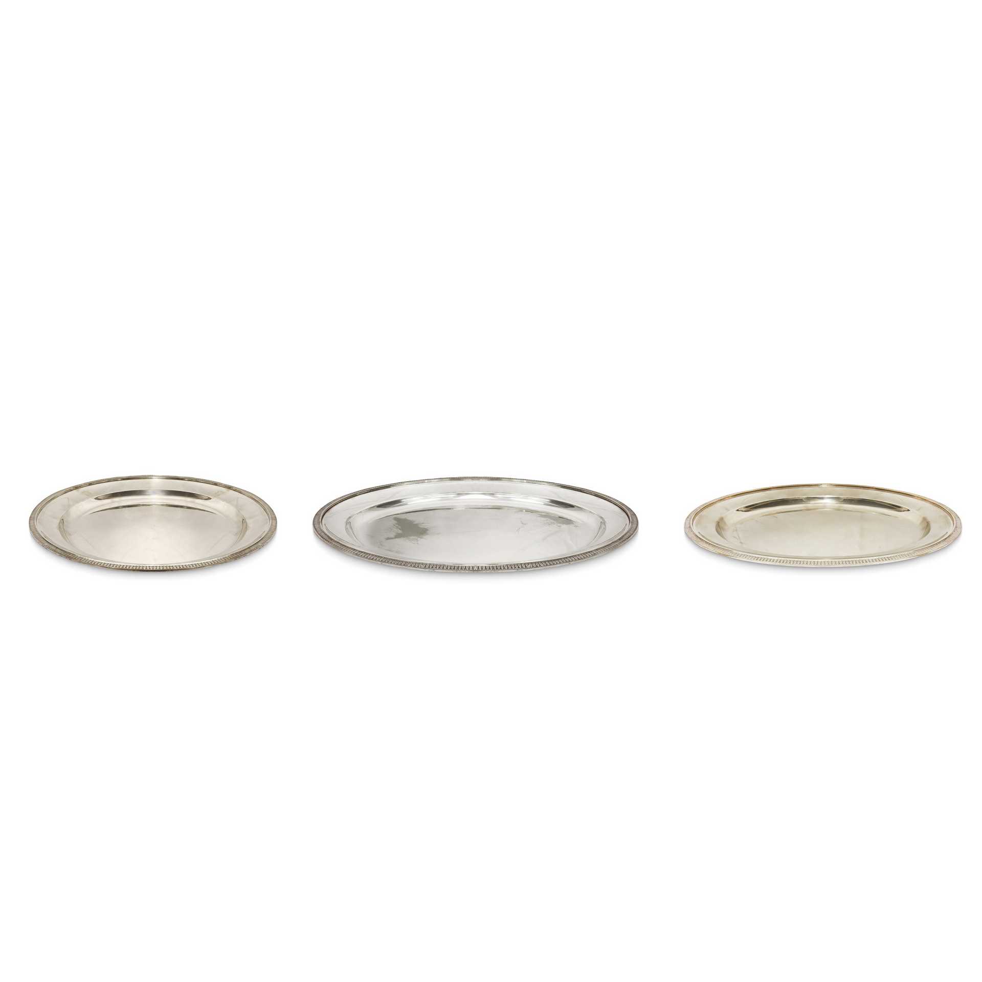 Fabbrica Macabo - Gruppo di tre vassoi da portata ovali in silver, 20° secolo L cm 40 x 30 (ovale) / 47x 35(ovale) / 40 cm (rotondo) Bordi bulinati con foglia lanceolata.Bordi bulinati con foglia lanceolata.