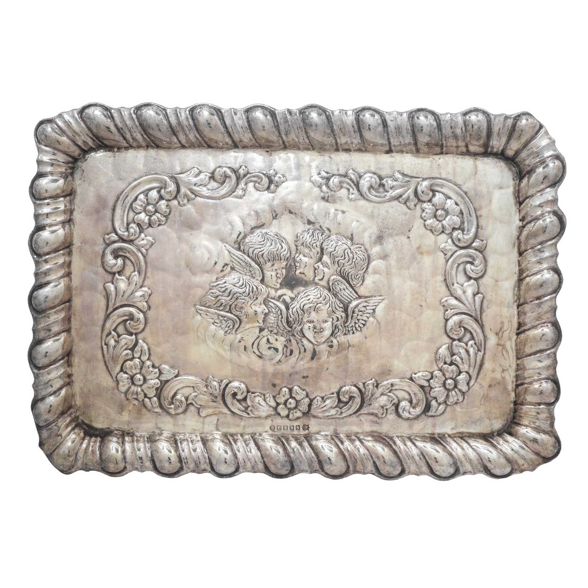 Vassoietto in epns sbalzato con teste di Zefiri cm 30,5X20 Inciso sul fronte marchio EPNS (electro plated nichel-silver) materiale ricavato in Inghilterra alla fine del '700Inciso sul fronte marchio EPNS (electro plated nichel-silver) materiale ricavato in Inghilterra alla fine del '700