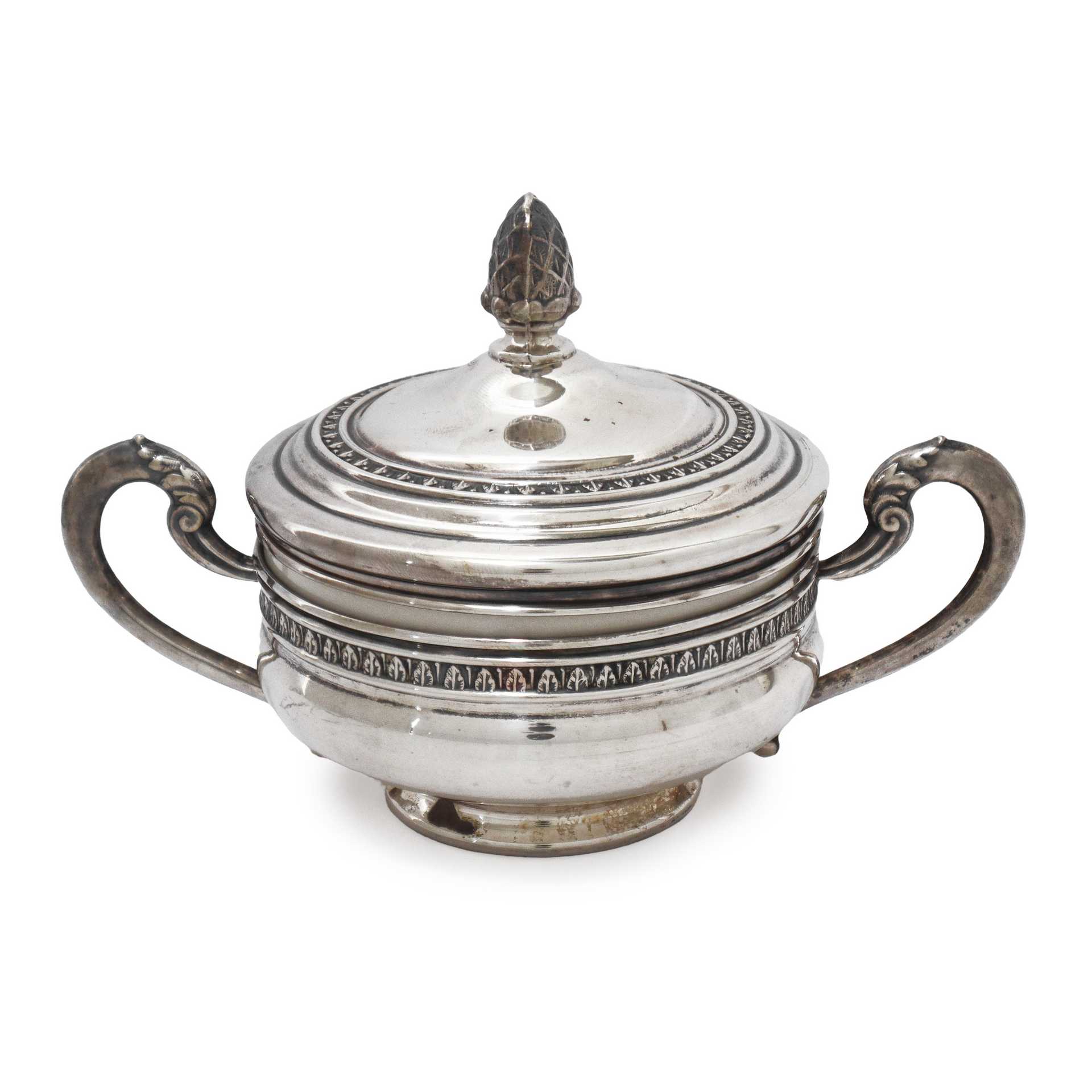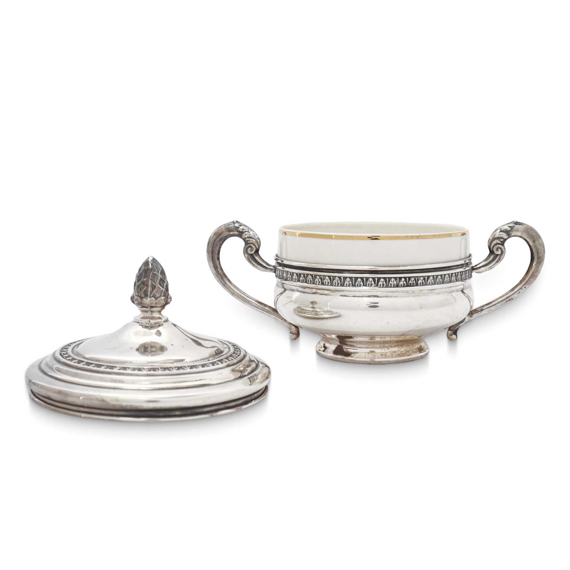 Zuccheriera stile impero rivestita in argento 800, porcellana all'interno