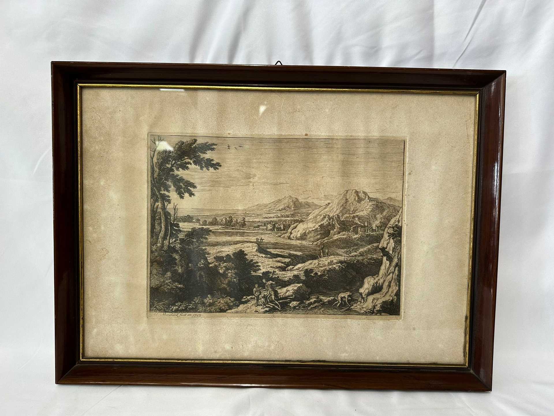 Paesaggio con personaggi Incisione all'acquaforte Firmato in basso a sinistra MAMGLARD e datato 1753