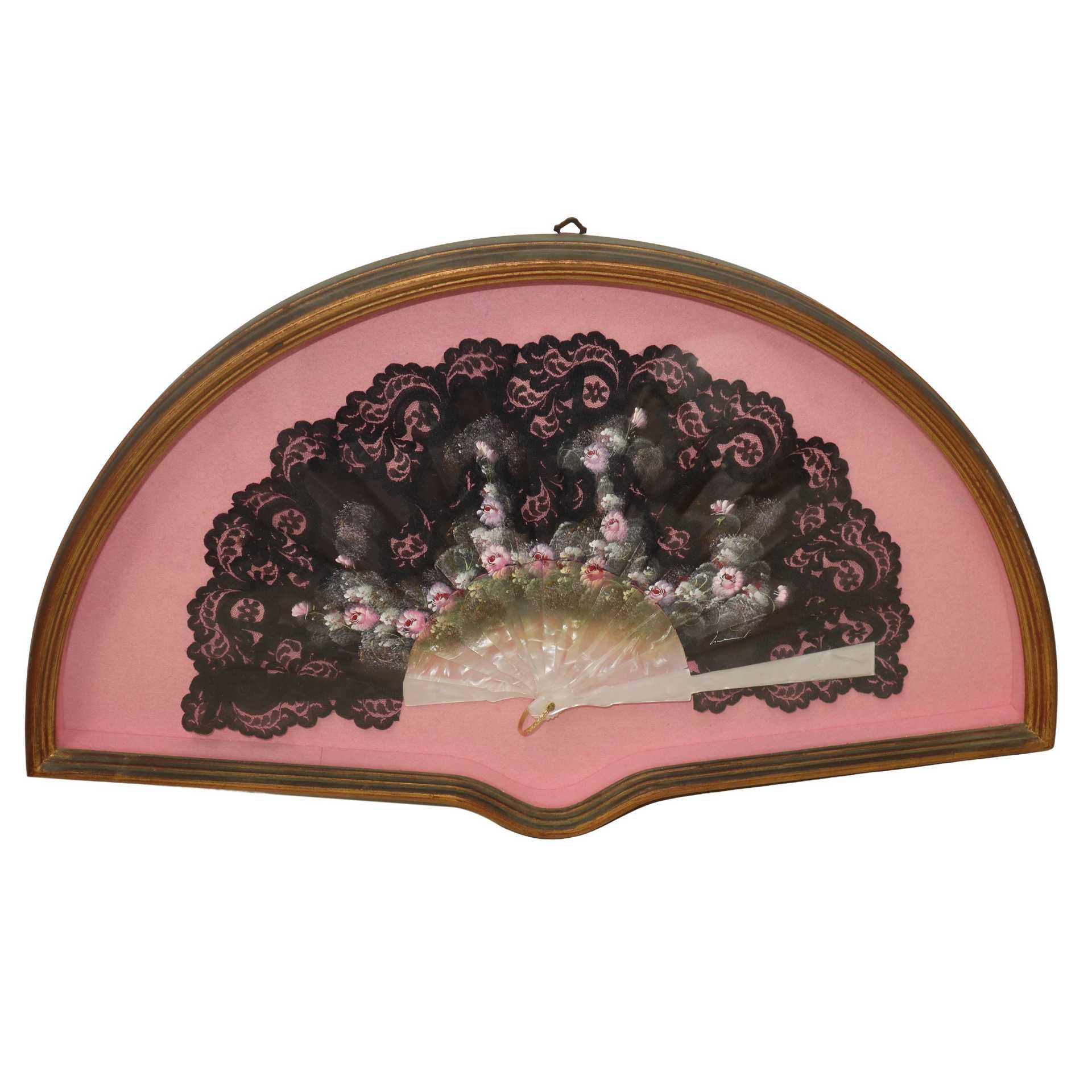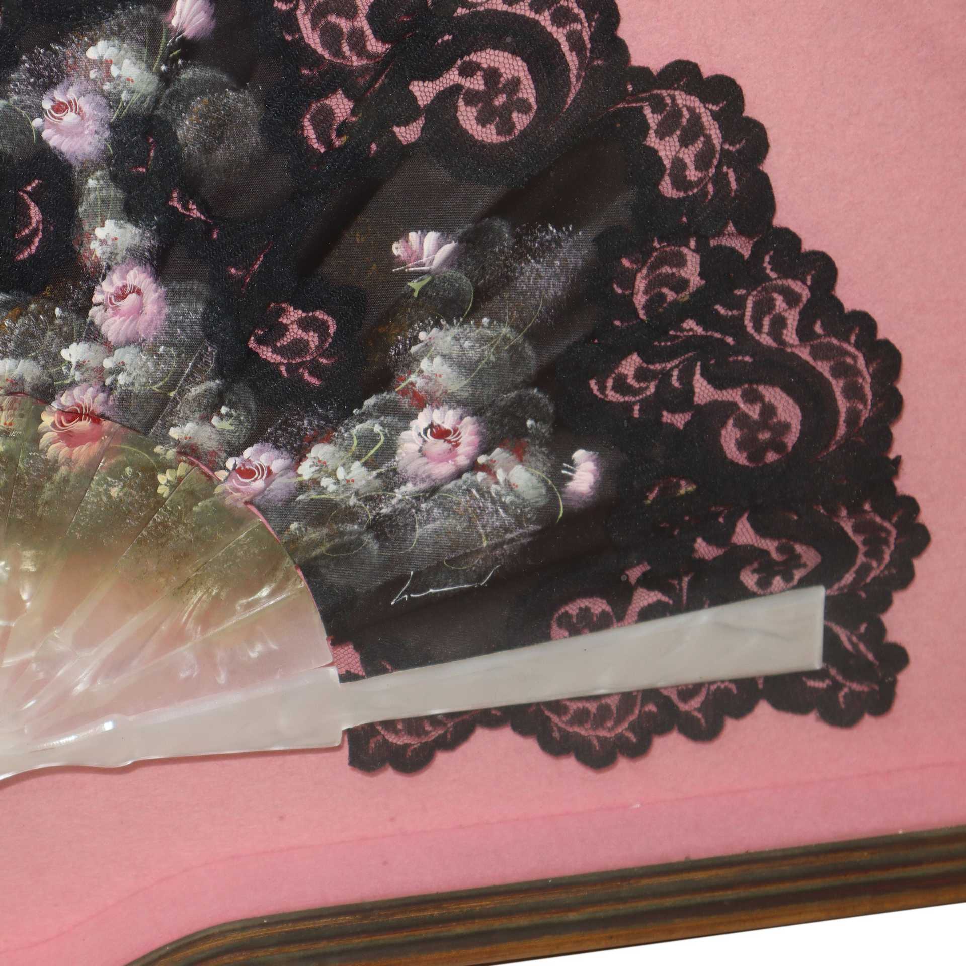 Ventaglio con stecche in simil madreperla e con merletto nero dipinto a mano, 20° secolo
