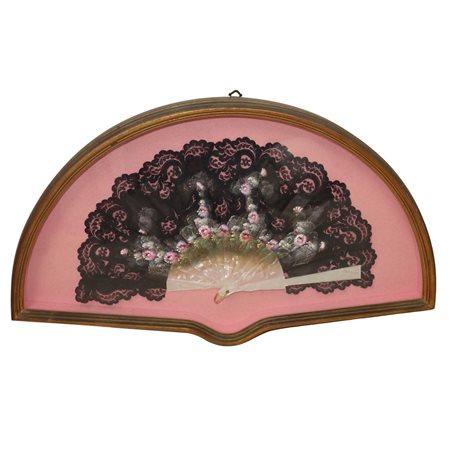 Ventaglio con stecche in simil madreperla e con merletto nero dipinto a mano, 20° secolo cm 40x70 In ventaglieraIn ventagliera