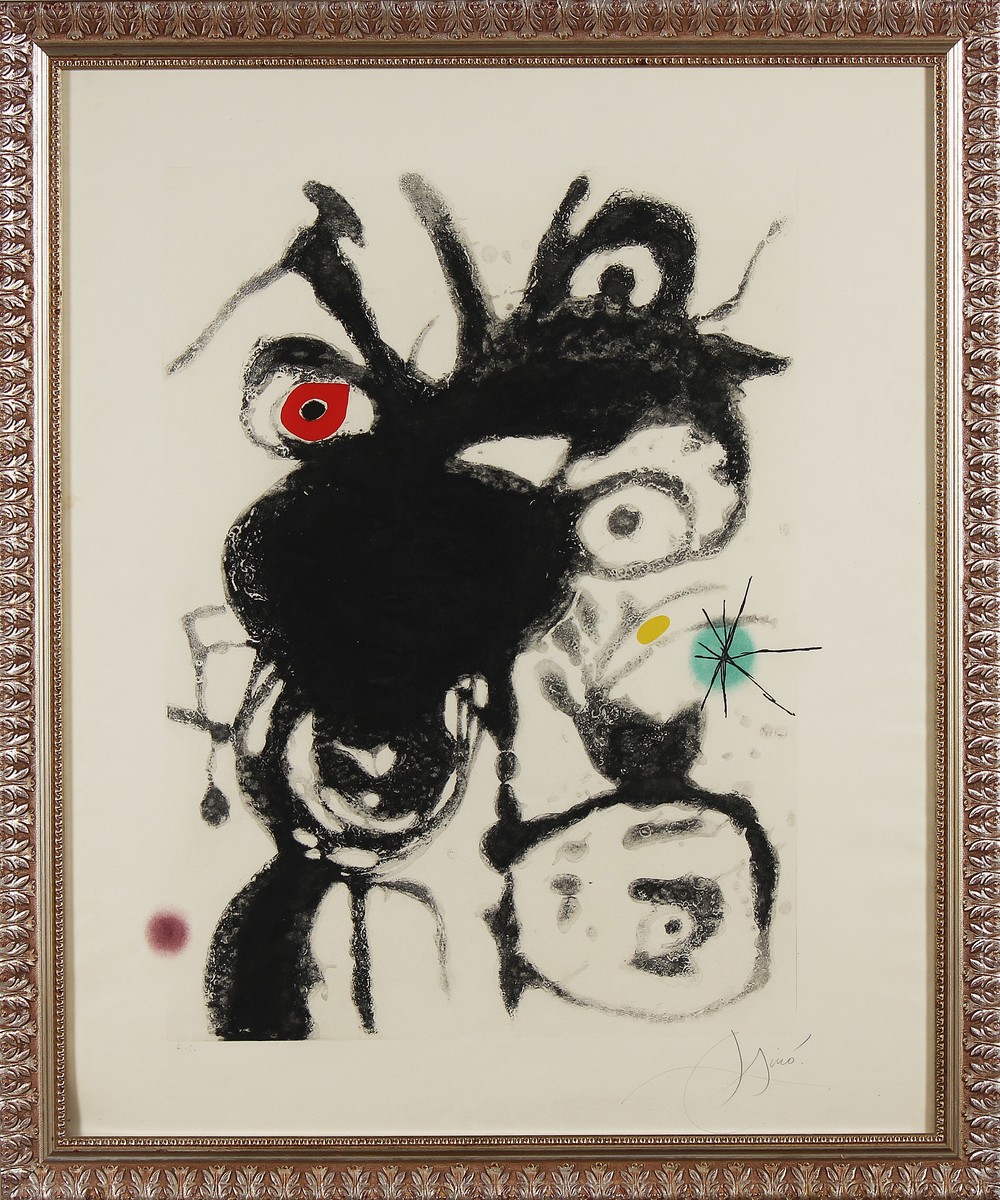 MIRO' JOAN (1893 - 1983) Senza titolo. Acquaforte, acquatinta, carborundum. Cm 70,00 x 85,00. H.C. Tiratura e firma in basso a matita. Dimensioni lastra: cm 70x50. In basso a sinistra timbro a secco Sala Gasbar. Quinta tavola da Espriu- Mirò. 1975. Poesie di Salvador Espriu e tavole di Joan Mirò. Sala Gaspar Editore, Barcellona 1975. Stampatore F.F.Torralba, Rubi (Barcellona). Tiratura a 50 esemplari numerati e alcune prove fuori commercio stampate su carta "Guarro" con filigrana "Sala Gaspar". DUPIN III, 872. Cornice presente