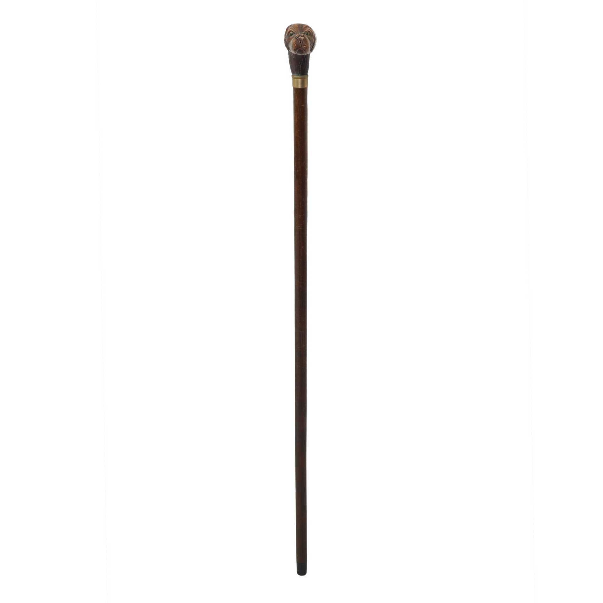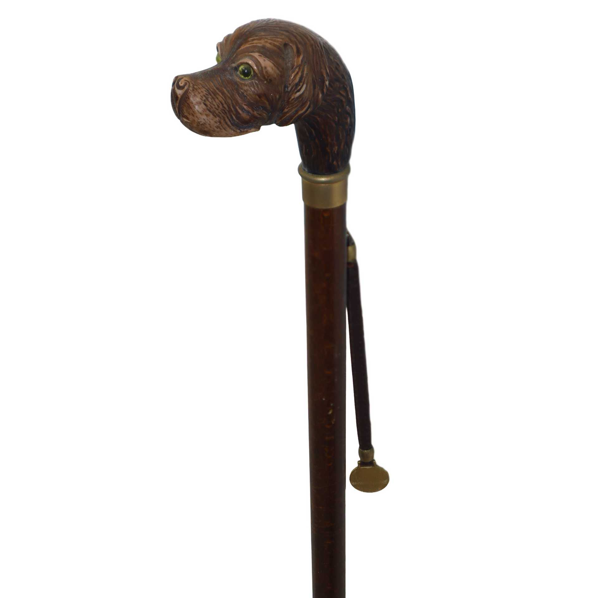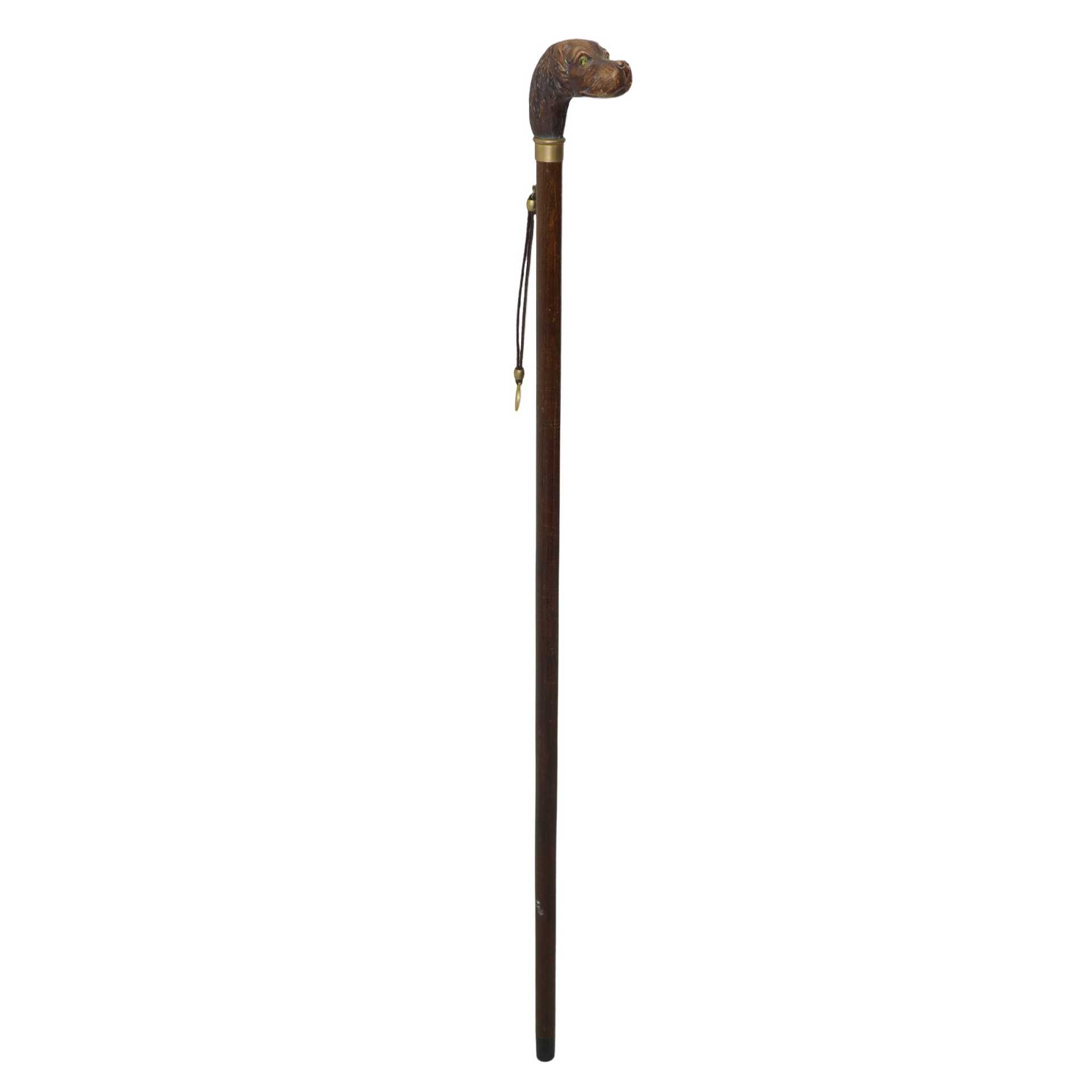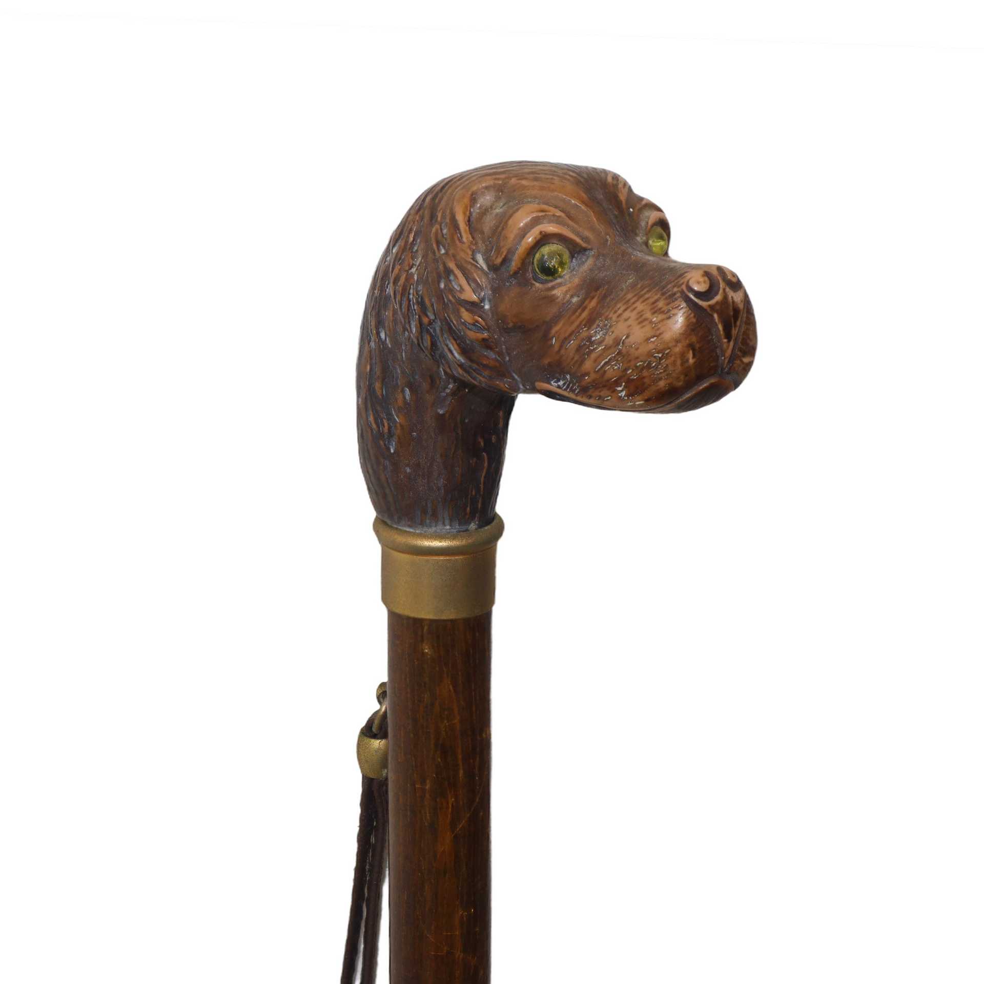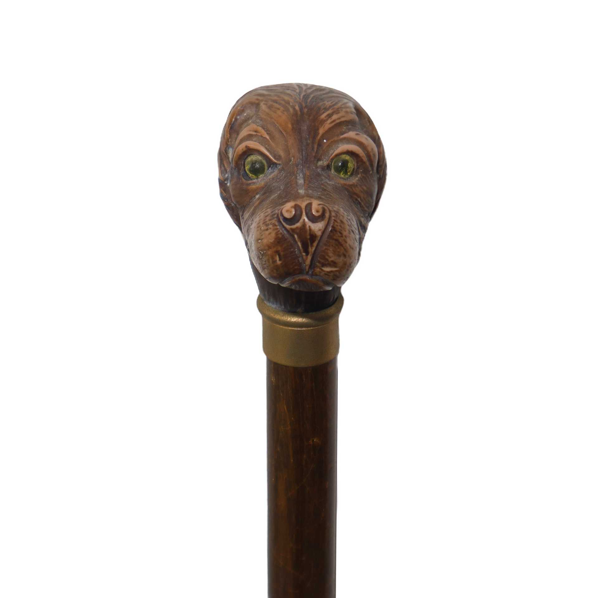 Bastone di legno con impugnatura a testa di cane con occhi di vetro