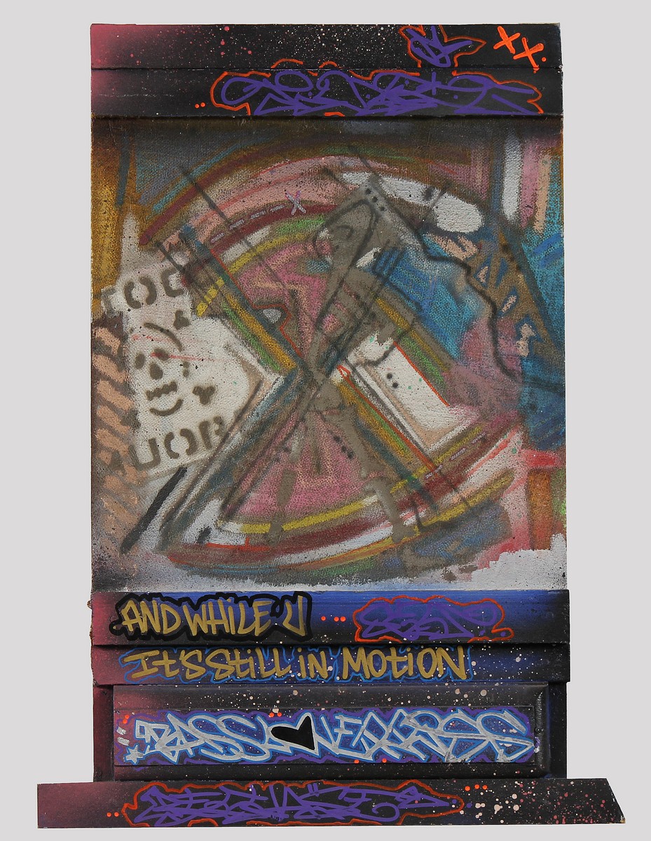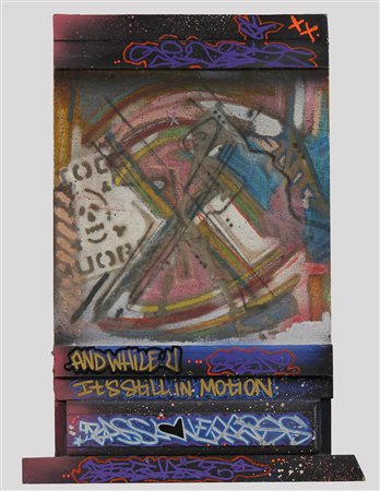 TOXIC (n. 1965) And while u... It's still in motion. Tecnica mista su tela su tavola. Cm 42,50 x 59,00. Titolo al fronte.