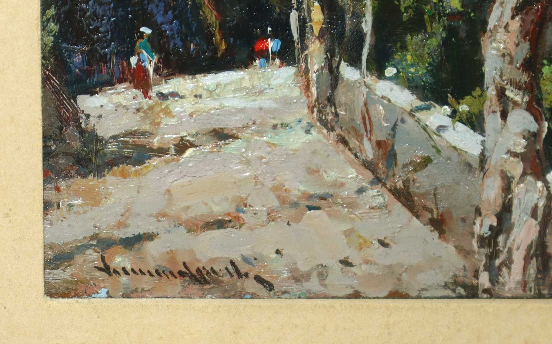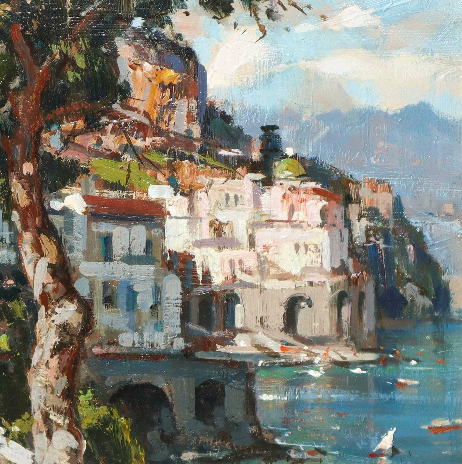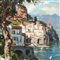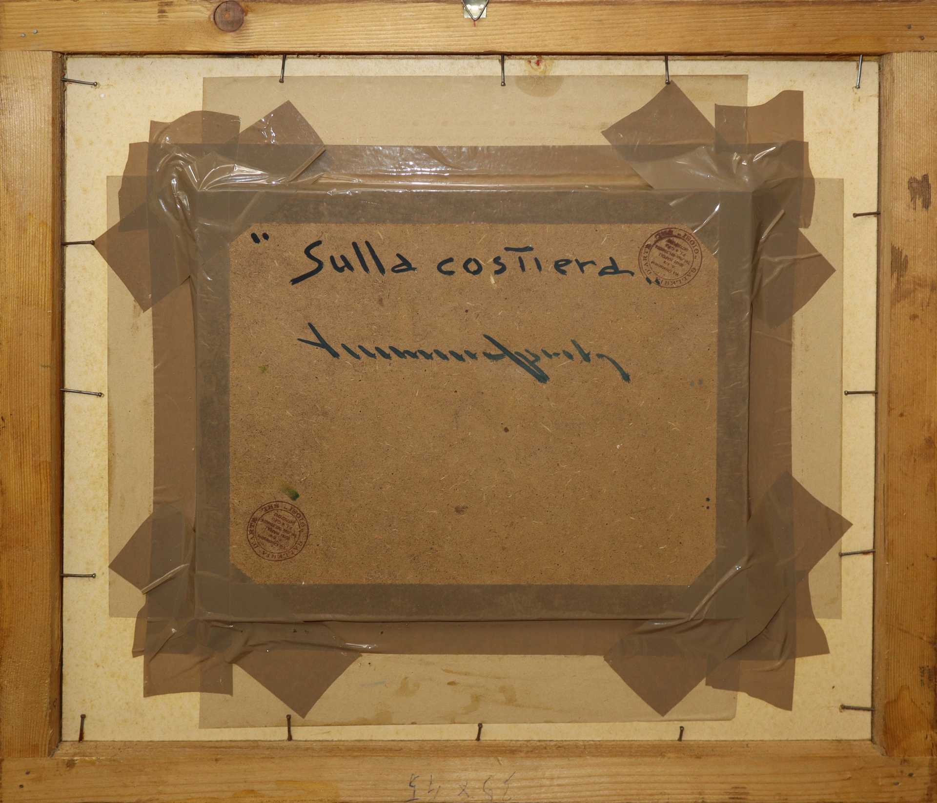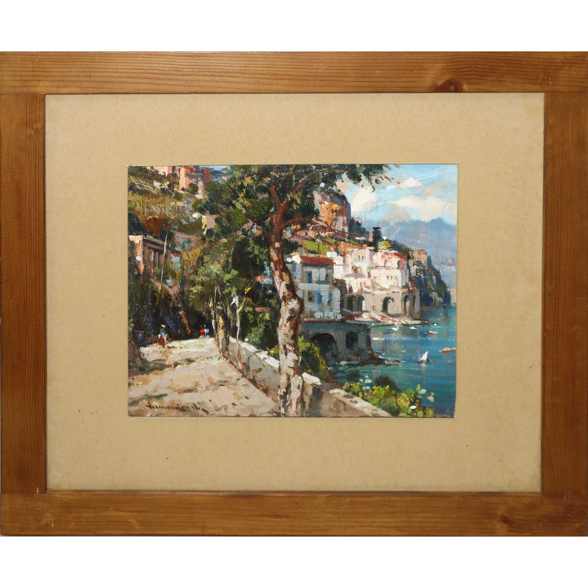 Vincenzo Aprile (Napoli 1952) - Sulla Costiera cm 25 x 30, in cornice 45 x 51 Olio su masonite Firmato sul fronte in basso a sinistra. Firma e titolo a retro, con timbro della Galleria Giosi, Napoli