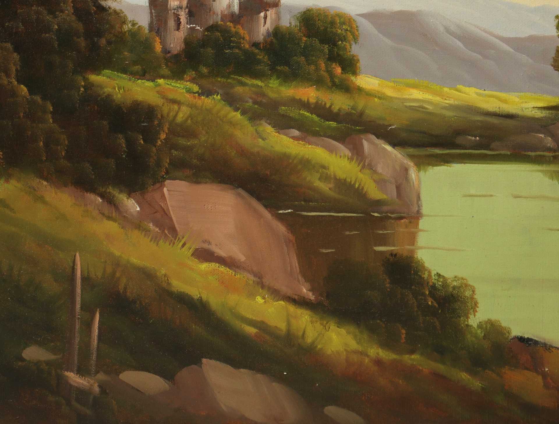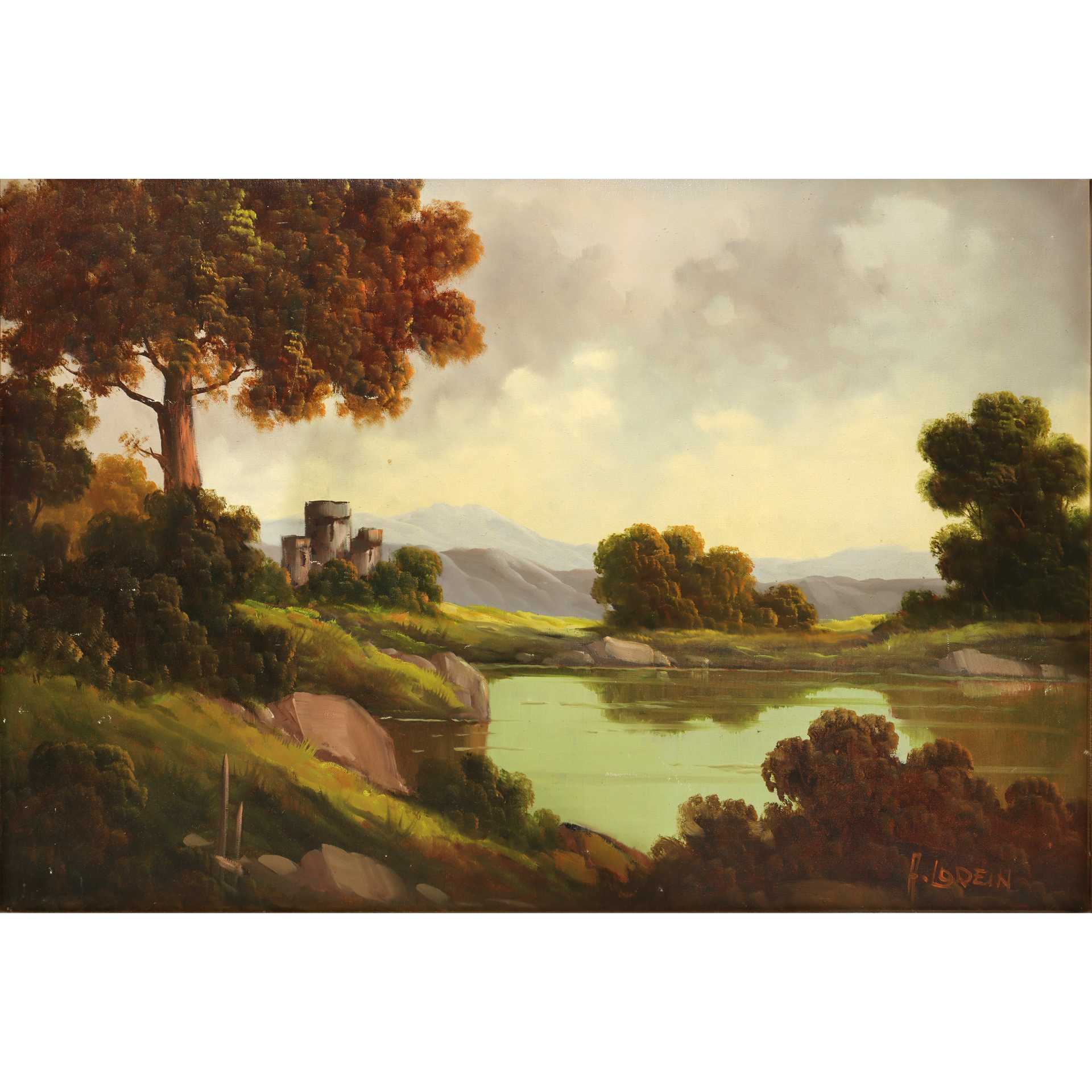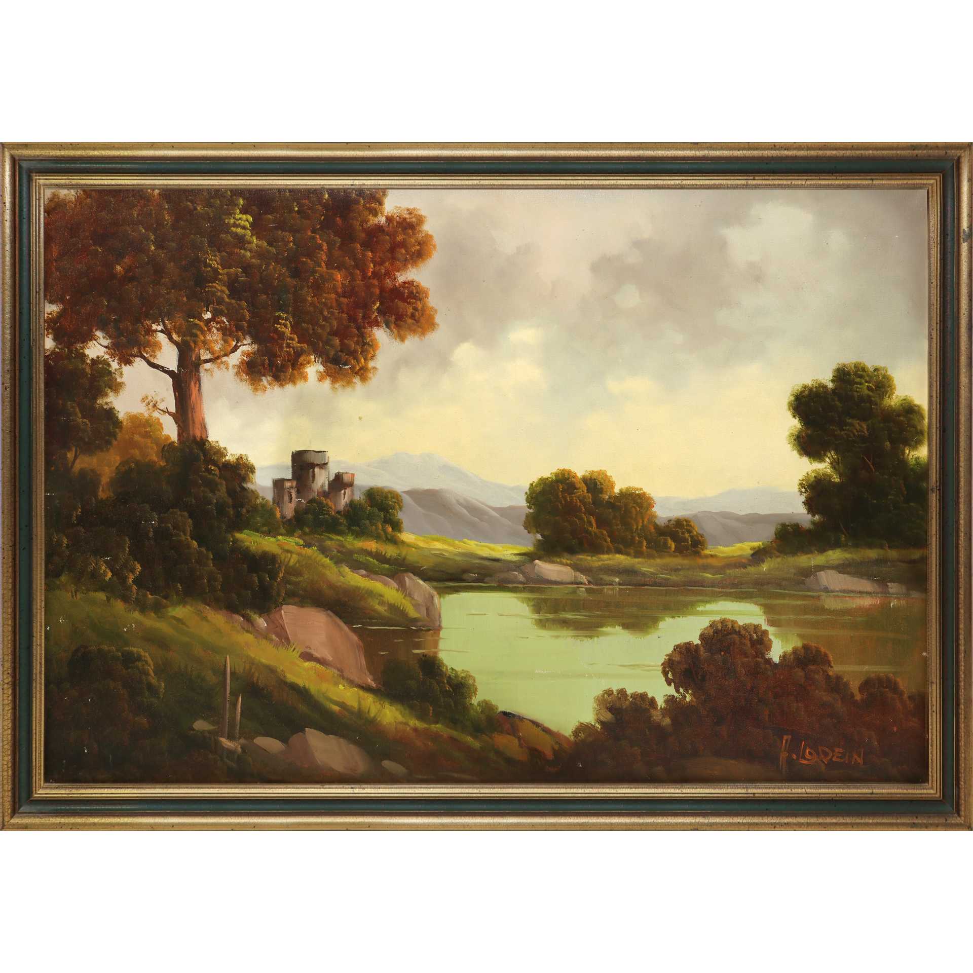 Paesaggio lacustre con alberi e castello arroccato H cm 50x70 - in cornice H cm 56x76 Olio su tela Firmato in basso a destra A. Lorein