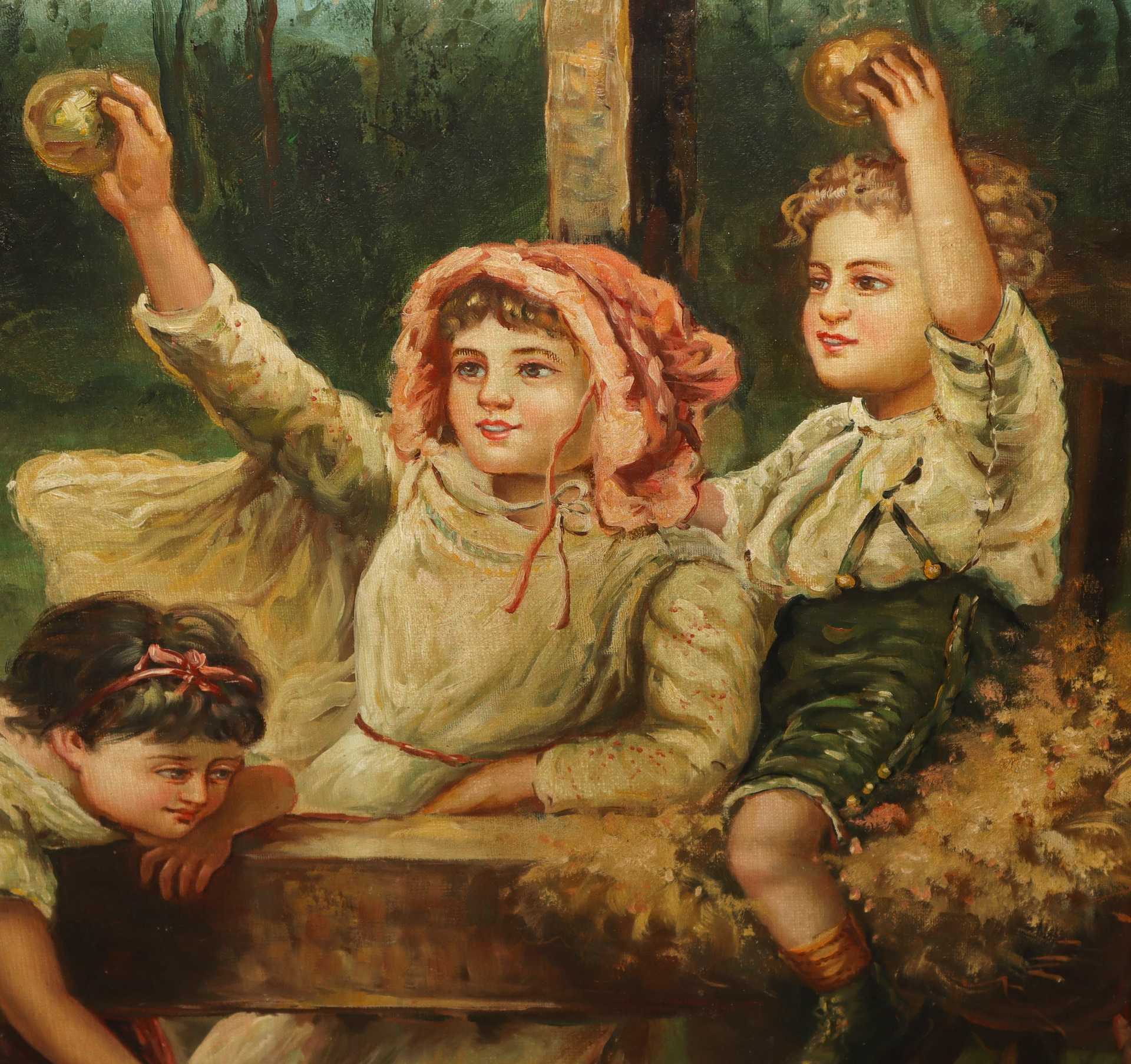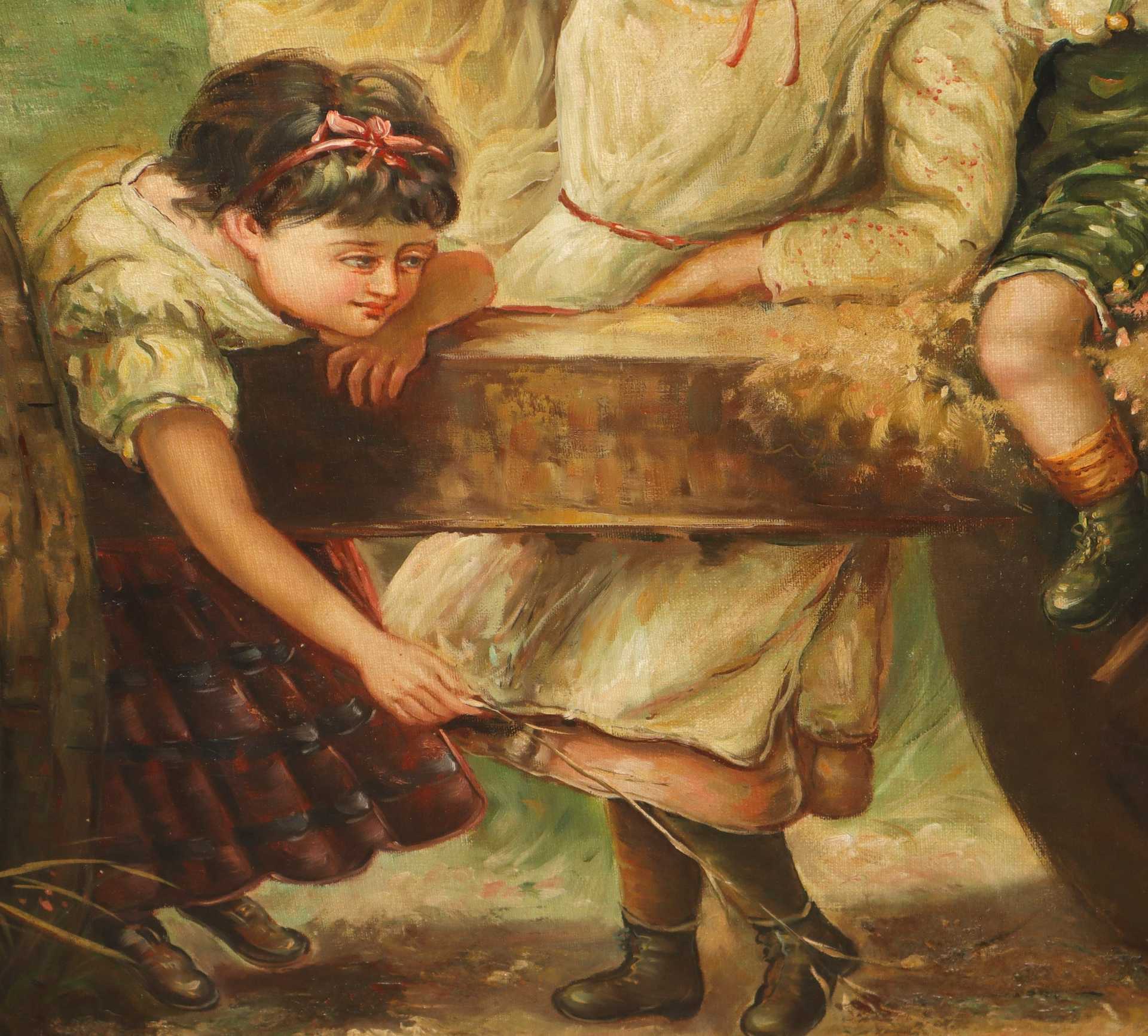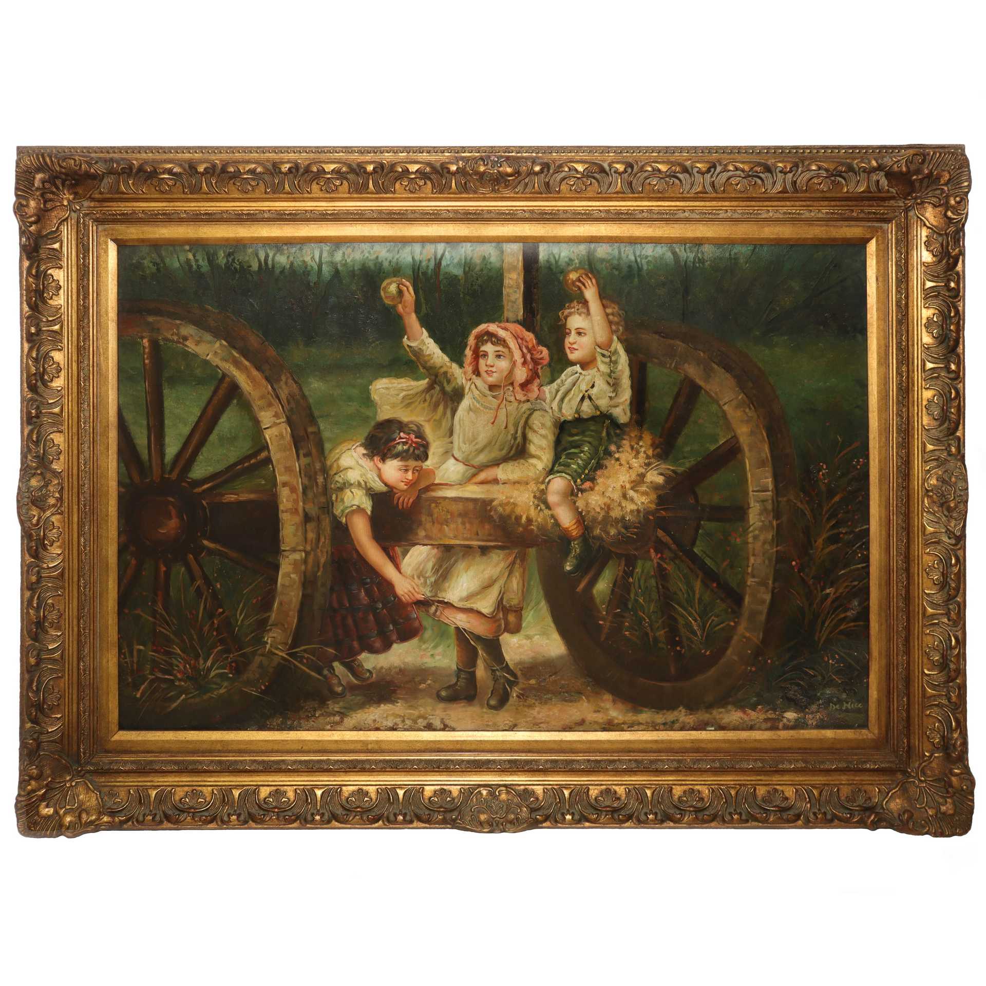 Tre bambini su ruote di carro H cm 60x90 - in cornice H cm 83x113 Olio su tela Firmato De Nice in basso a destra