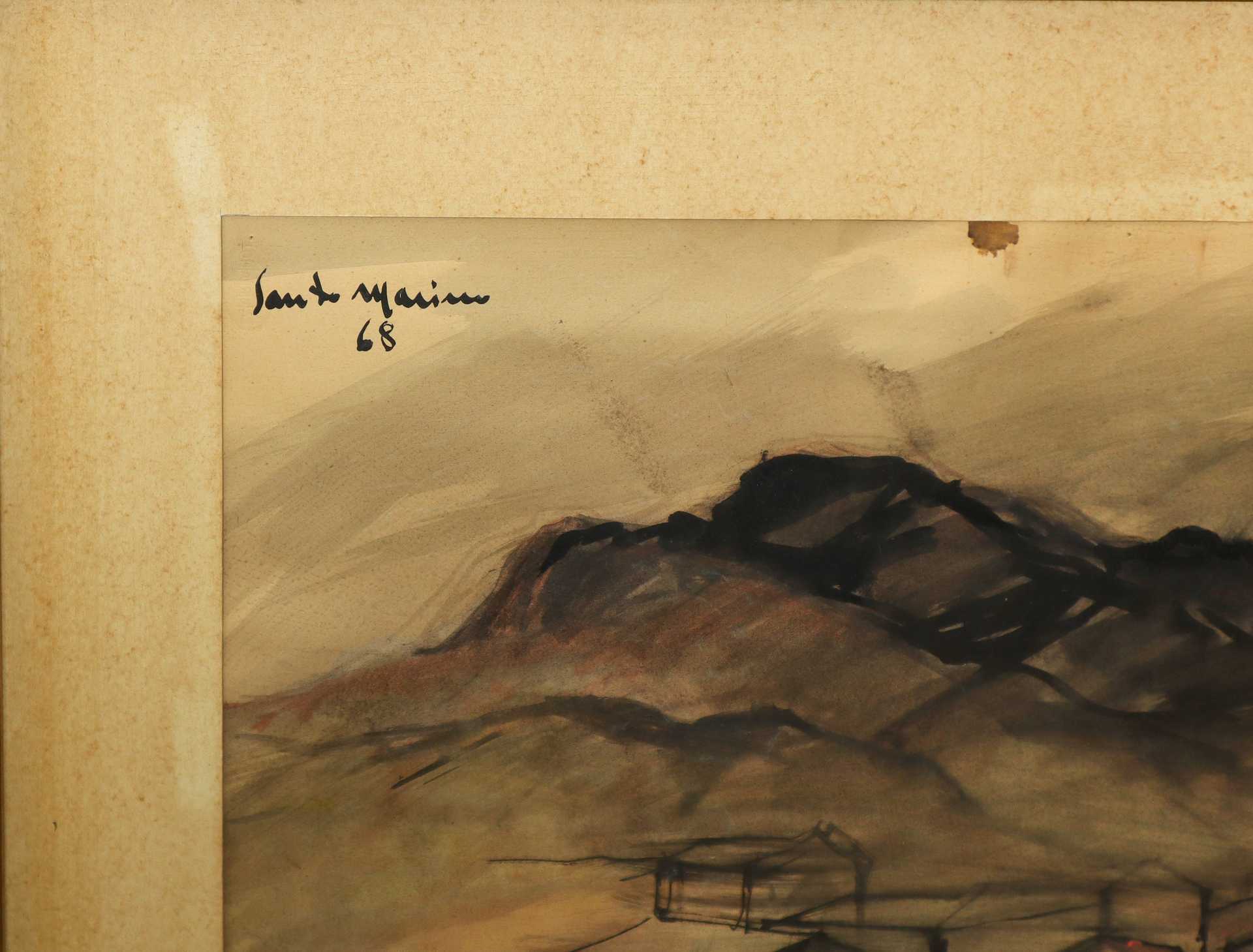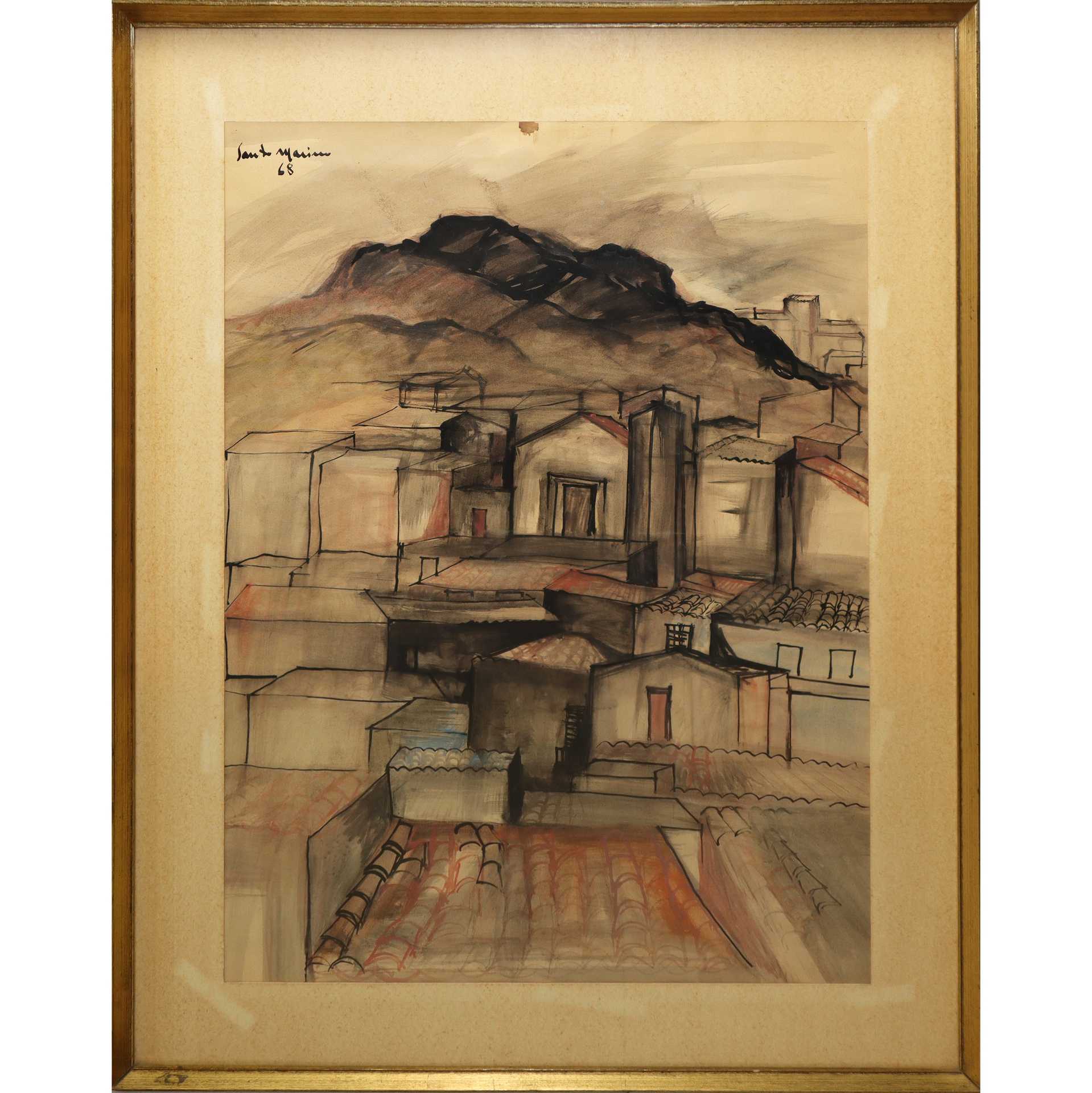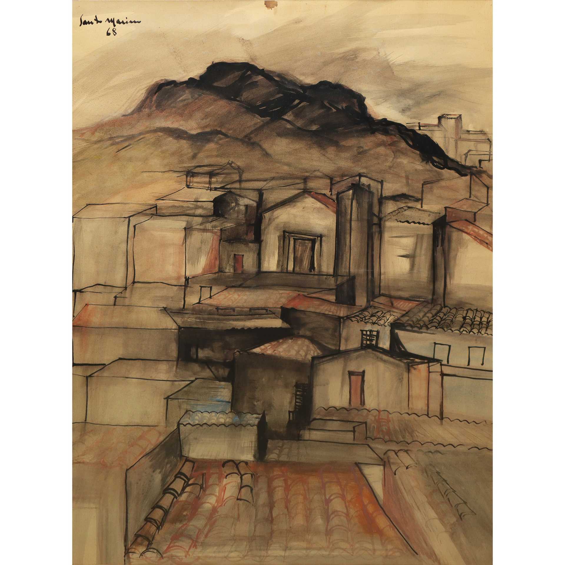 Santo Marino (Militello val di Catania 1924-1991) - Tetti di casi con monte, 1968 H cm 68x48 - in cornice H cm 85x64 Tecnica mista su cartone Firmato al fronte in alto a sinistra