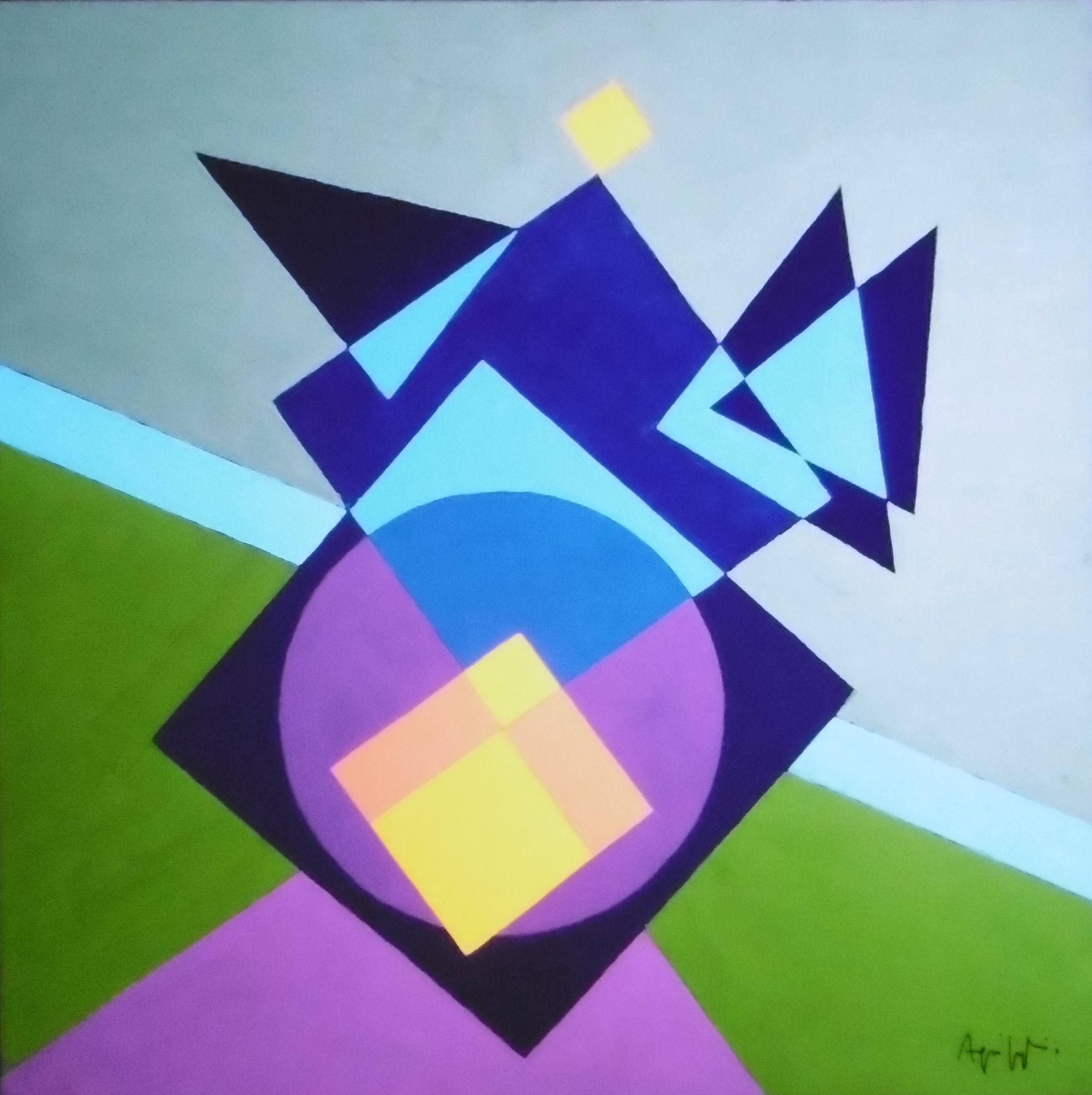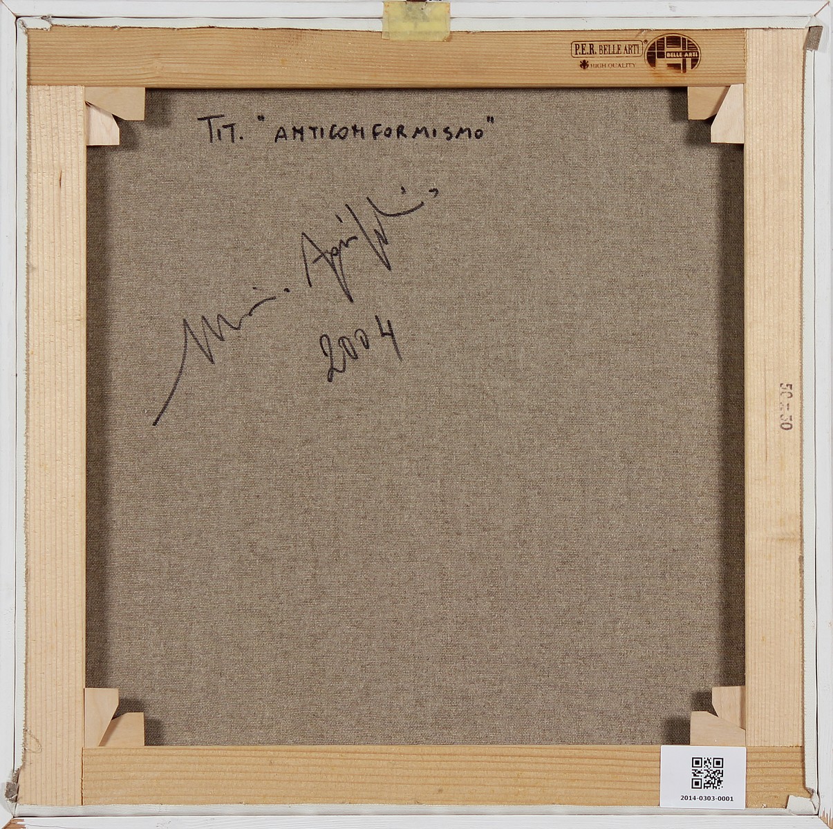 AGRIFOGLIO MARIO (1935 - 2014) Anticonformismo. 2004. Tecnica mista su tela. Cm 50,00 x 50,00. Firma in basso a destra. Al retro titolo firma e anno. Opera che risponde alla luce ultravioletta. Cornice presente
