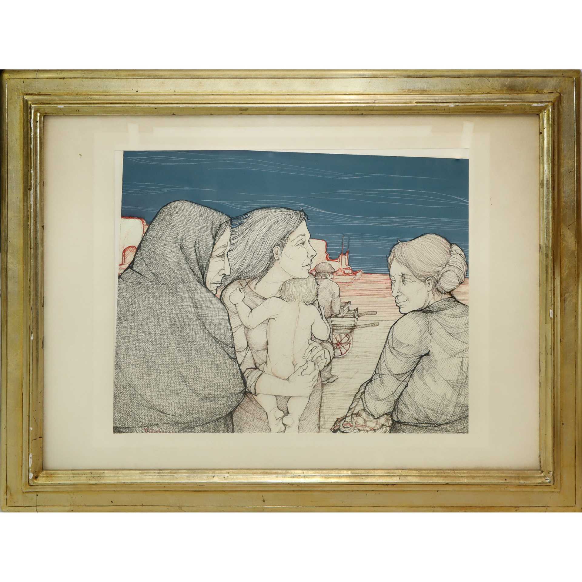 Tina Jacobs (Rijeka 1931-Milano, Italia 2003) - Donne con bambino cm 29x49 in cornice cm 61x81 tecnica mista china e acquerello Firmato in basso a sinistra. Timbro della pittrice al retro.