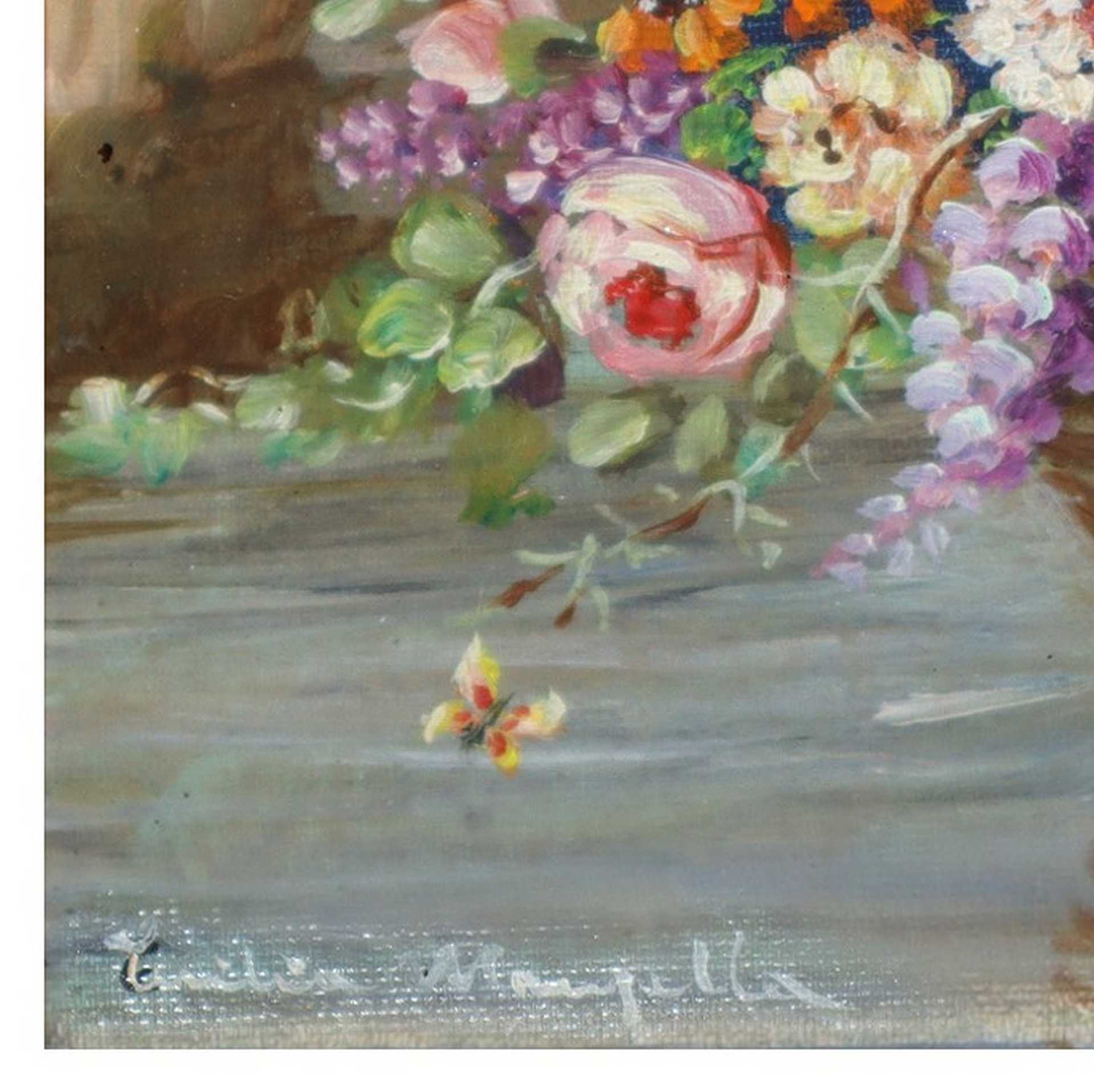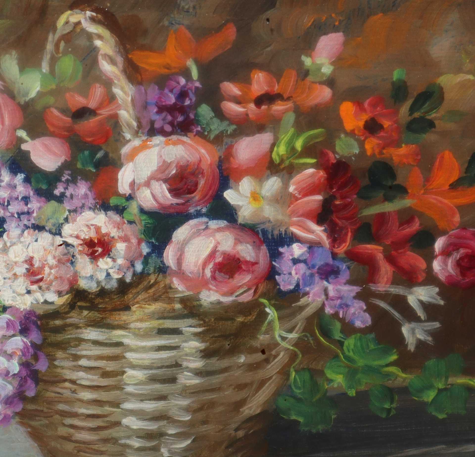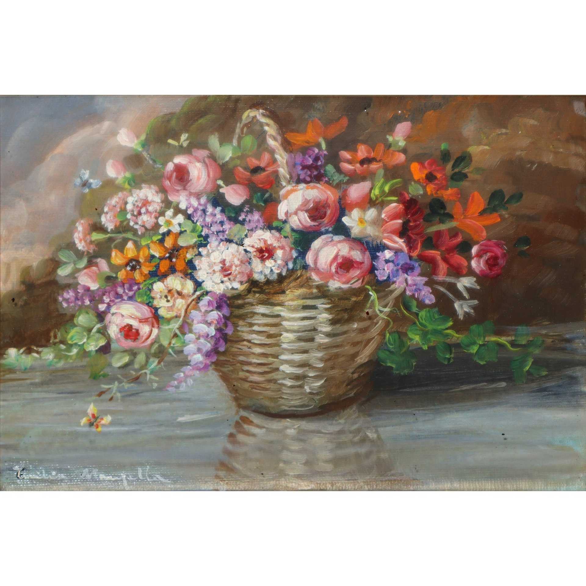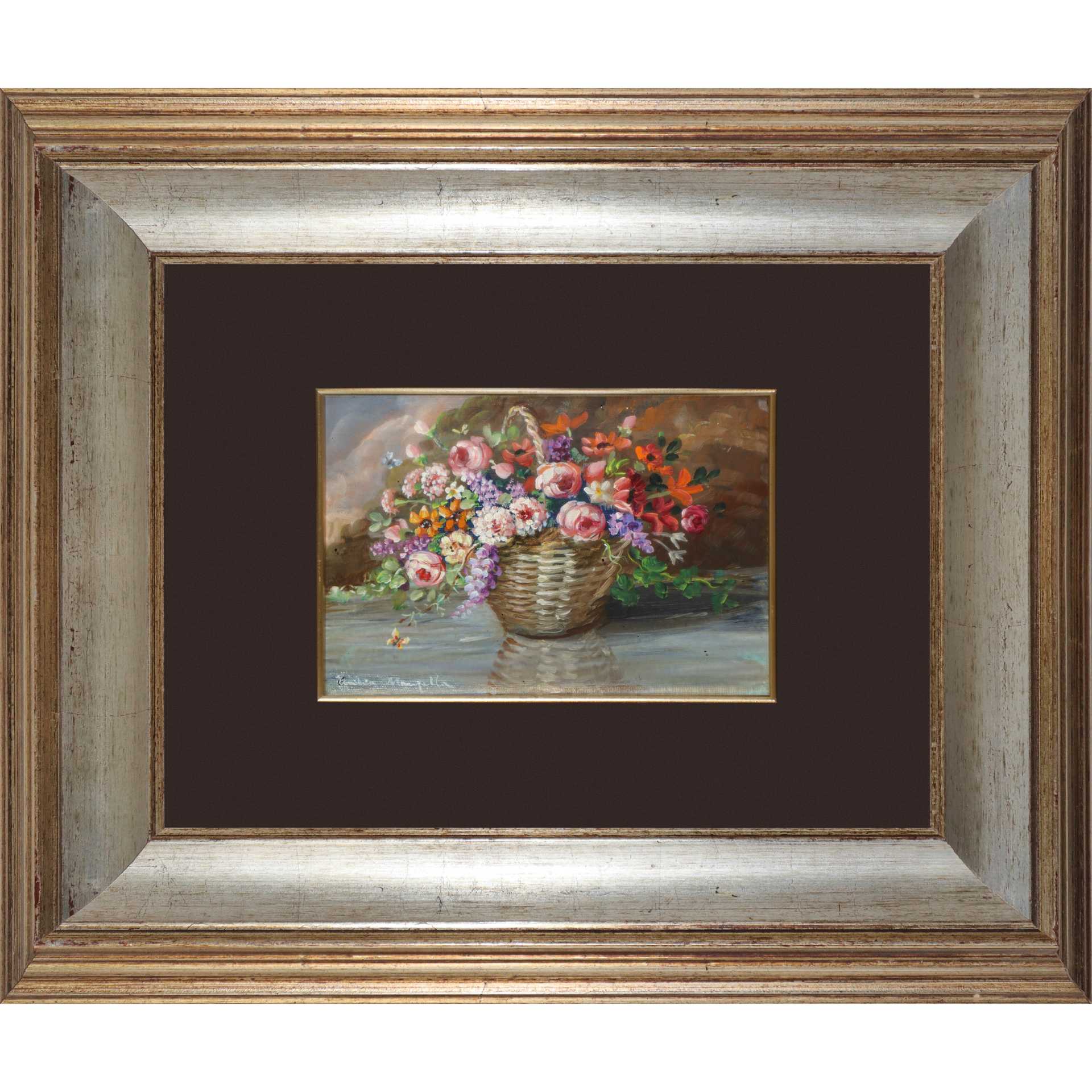 Cesta di fiori H cm 16x21, in cornice cm 43x48 Olio su masonite Firmato in basso a sinistra Cecilia Manzella