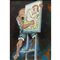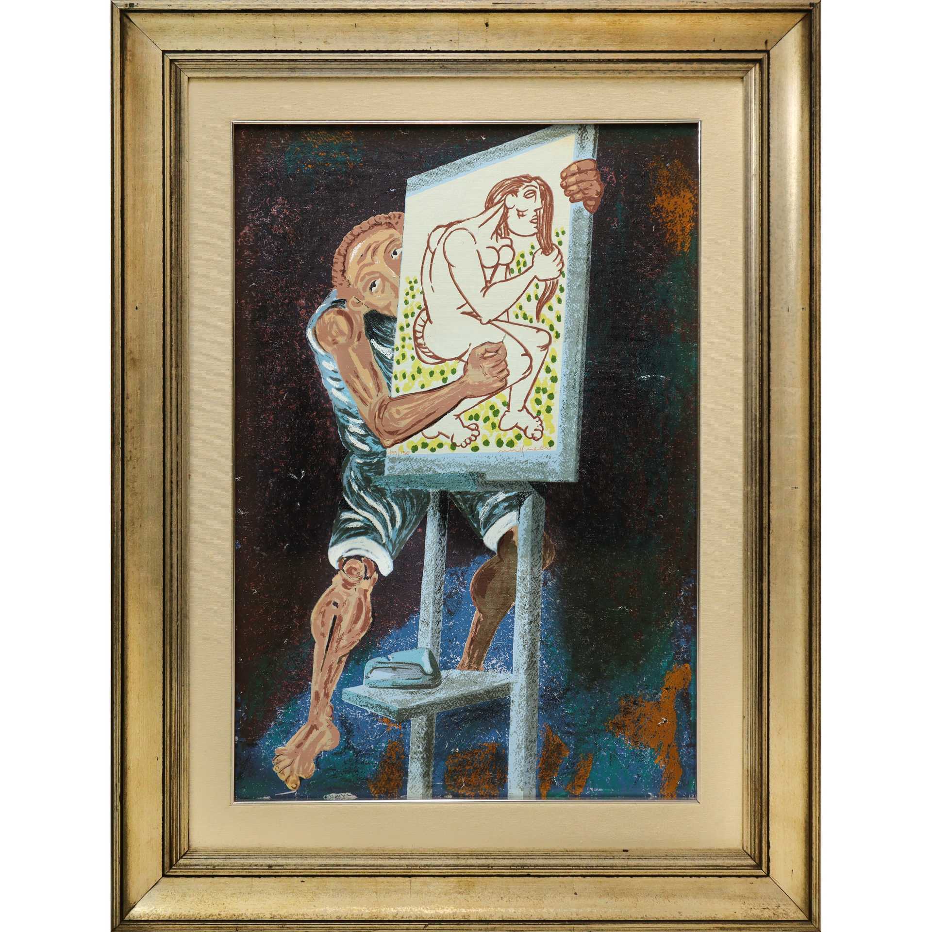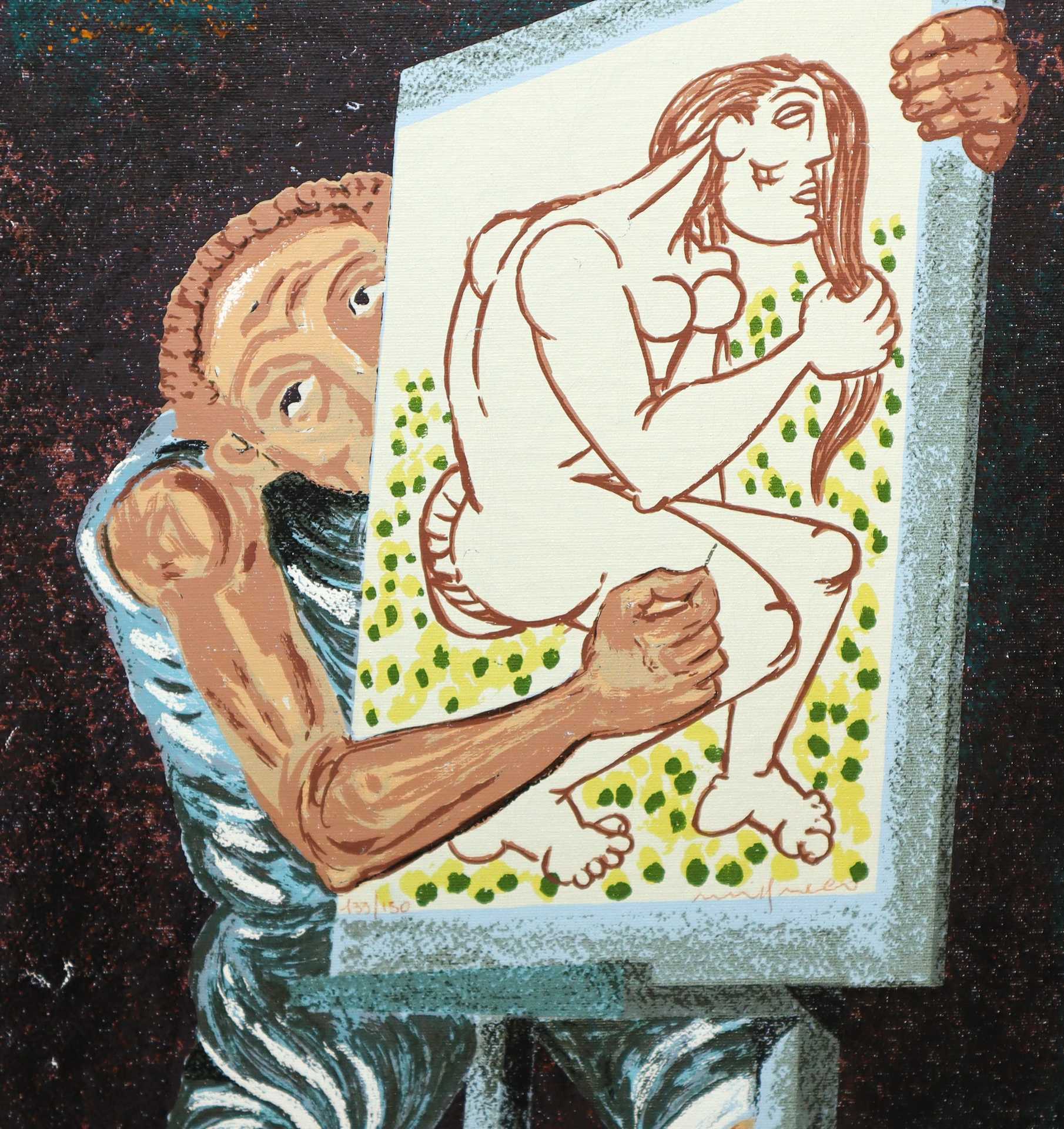 Giuseppe Migneco (Messina 1903-Milano 1997) - Uomo con quadro di donna H cm 65x45 - in cornice H cm 85x65 litografia colorata a mano su tela