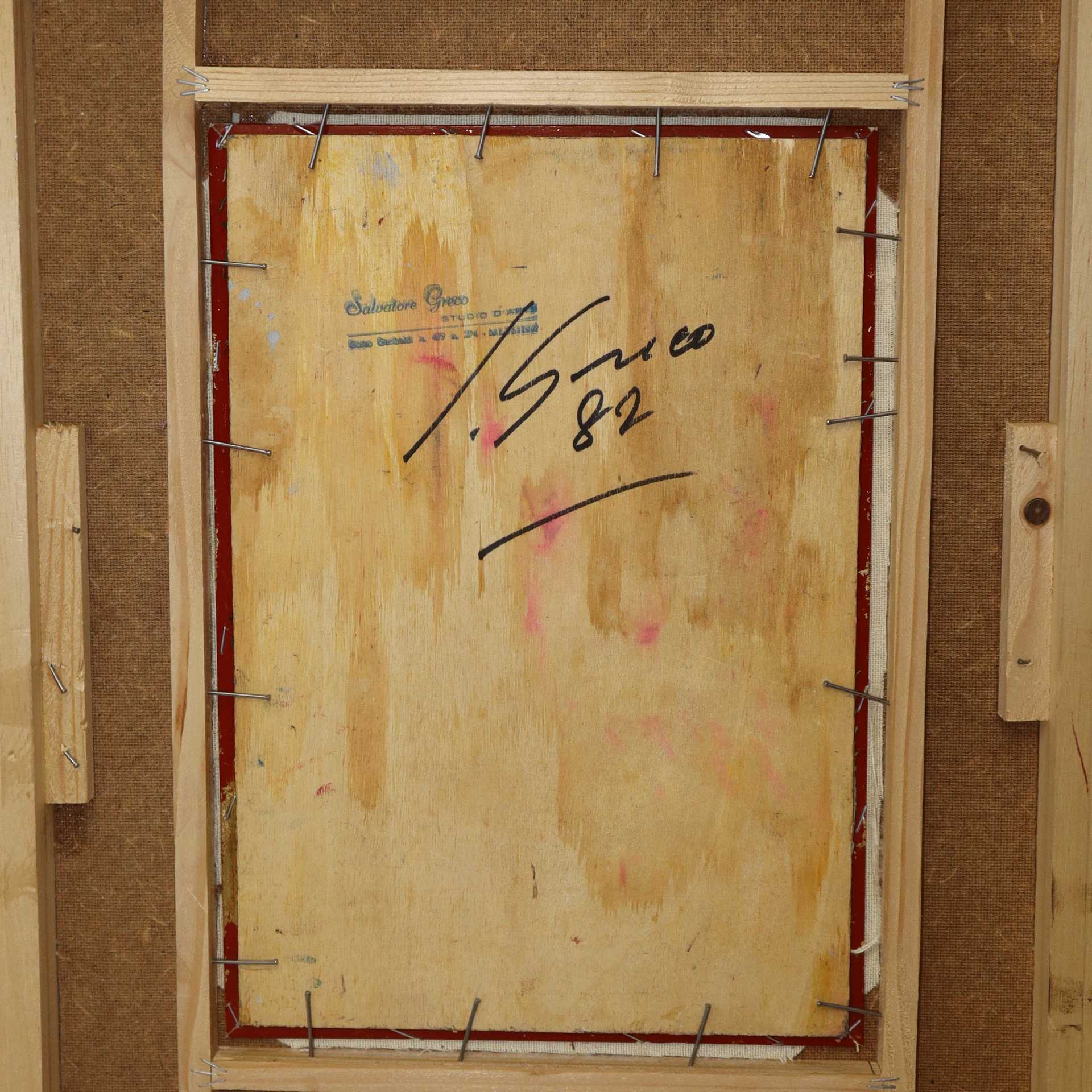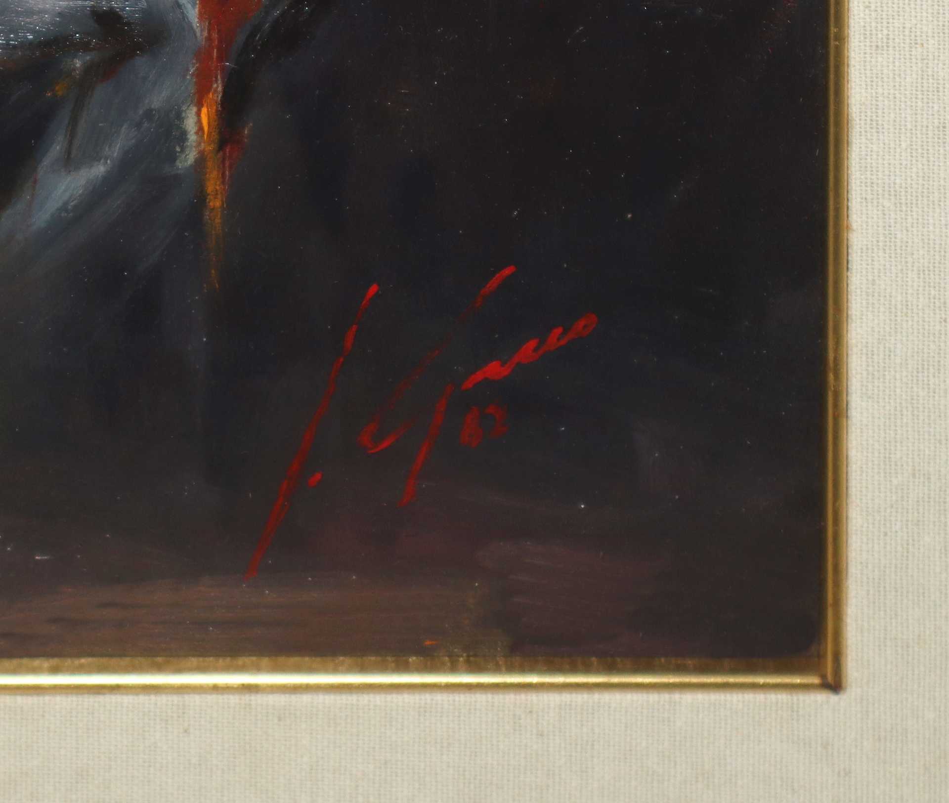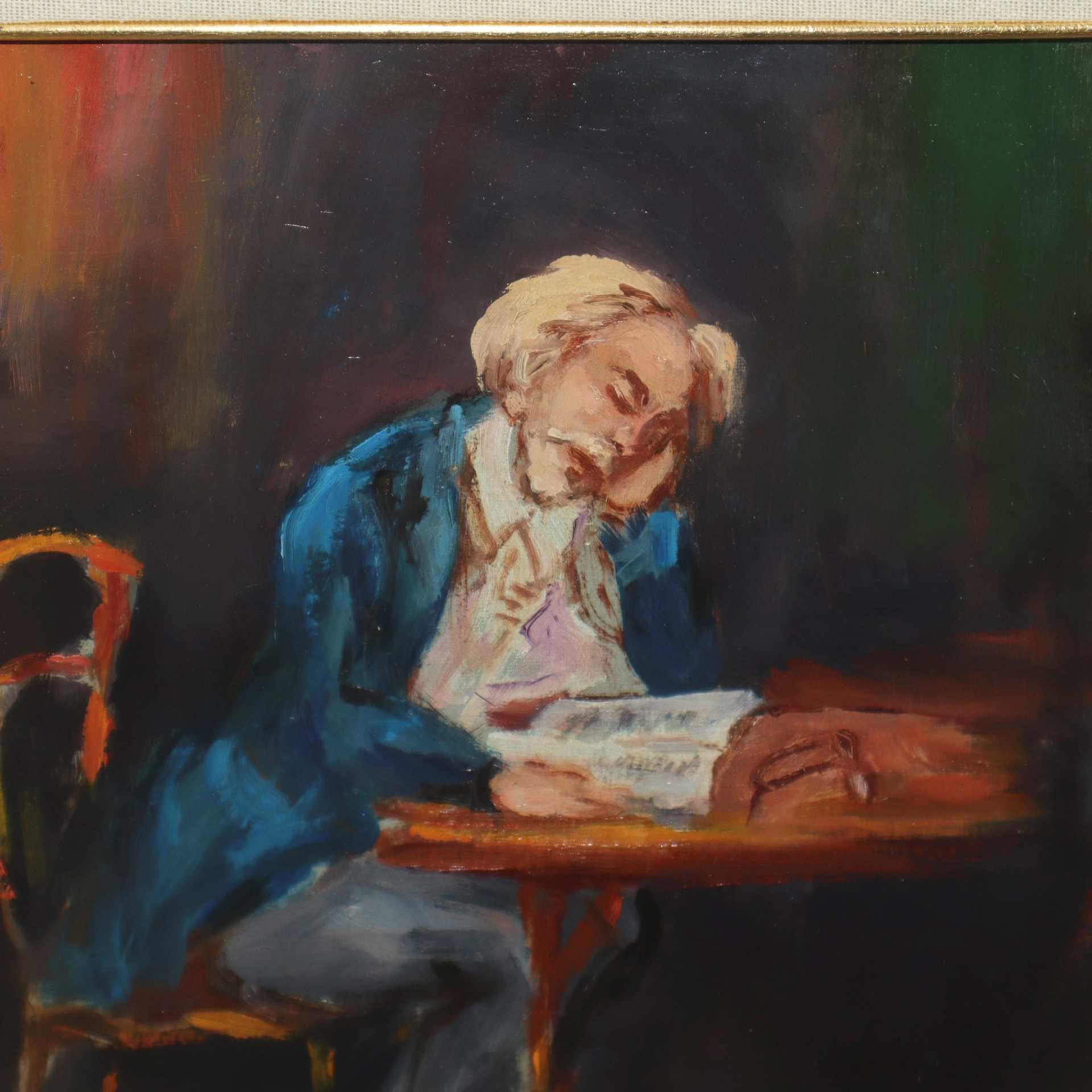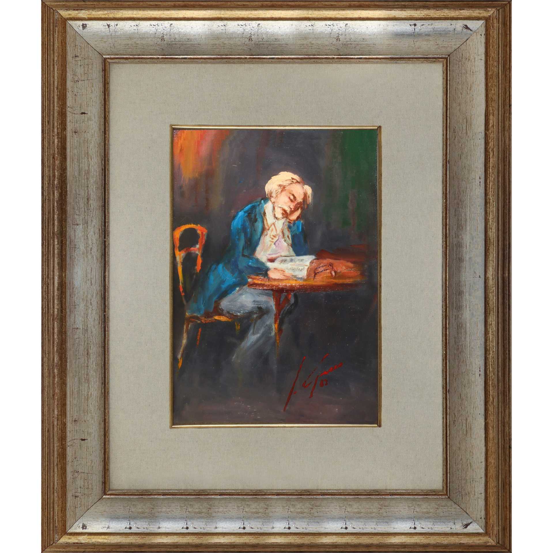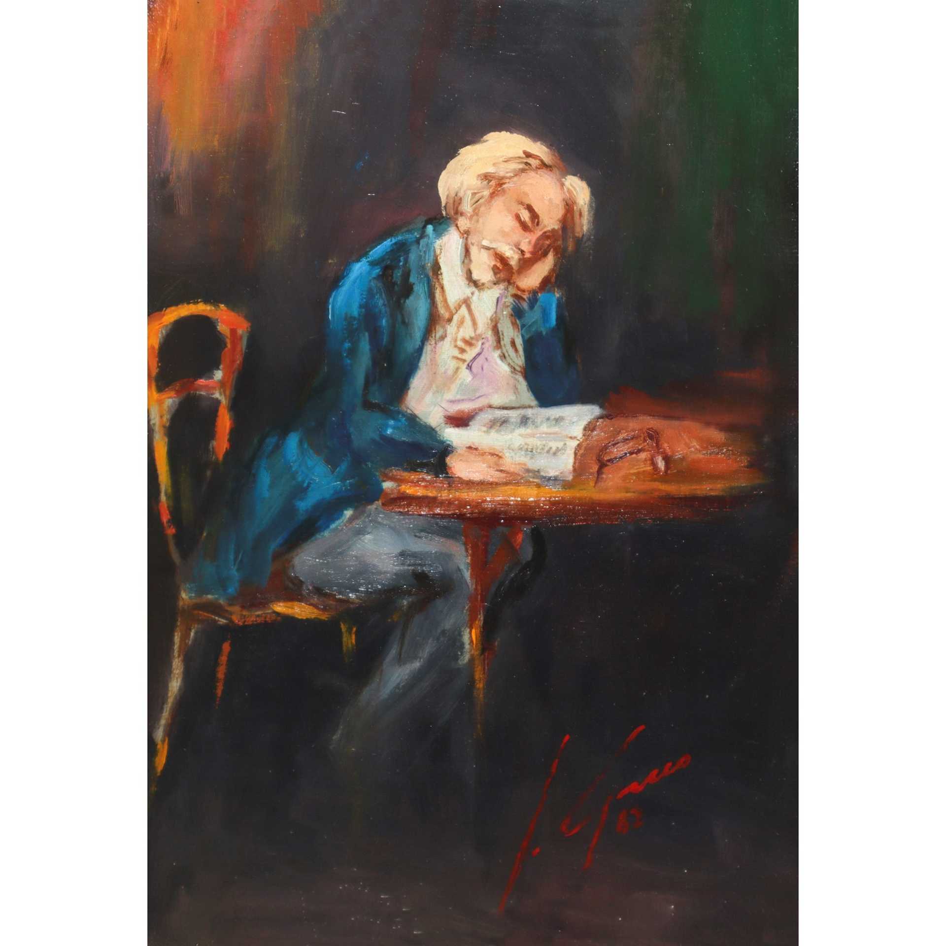 Compositore, 1982 cm 31x21,5 in cornice 60x50 Olio su tavoletta Firmato e datato in basso a destra S. Greco