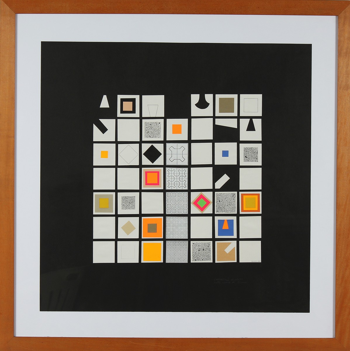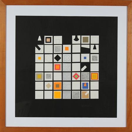 MUNARI BRUNO (1907 - 1998) Variazioni aleatorie sulla curva di Peano. 1969. Collage su carta. Cm 70,00 x 70,00. Firma e anno in basso a destra. Autentica dell' artista su fotografia. Cornice presente
