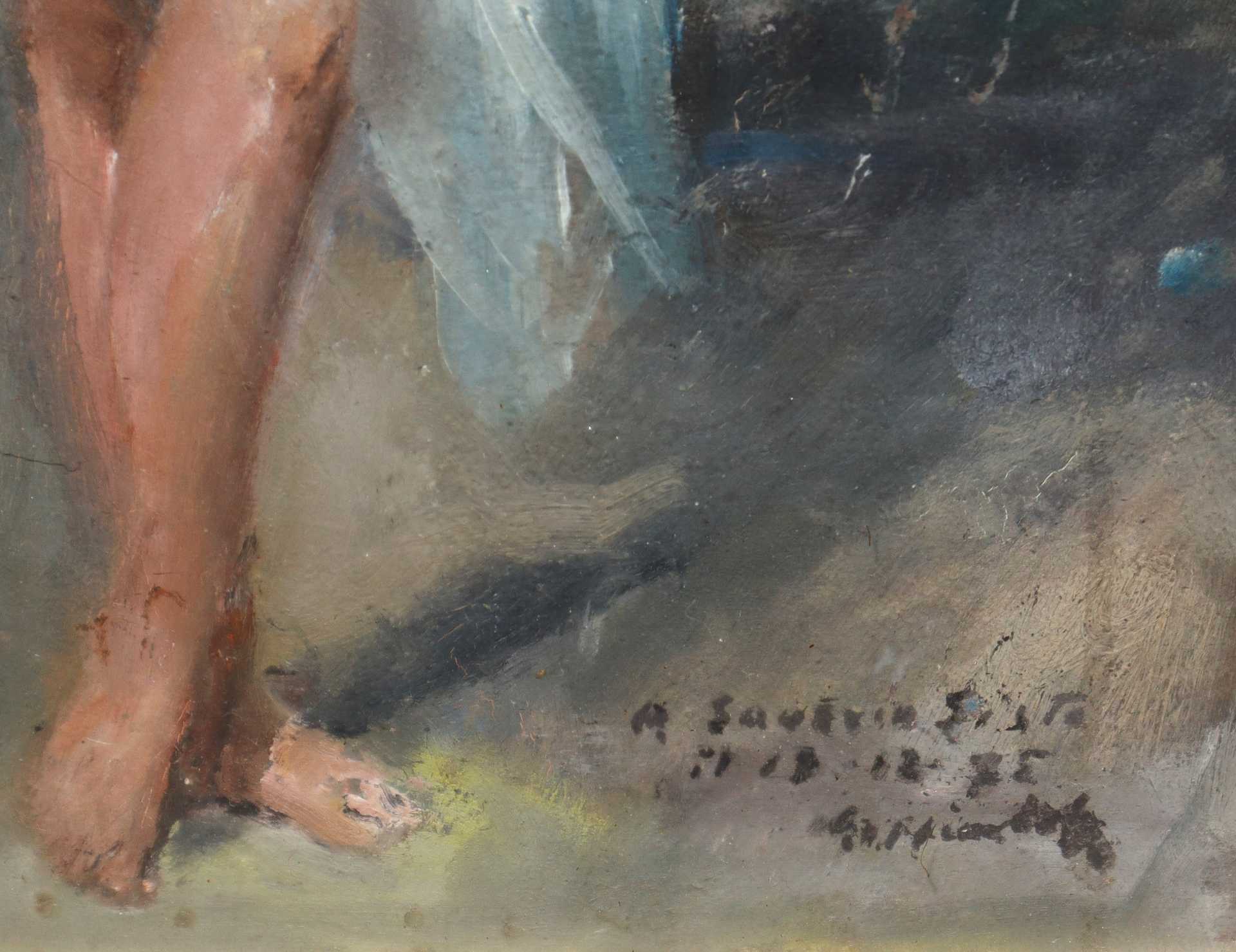 Nudo di donna cm 40x25, in cornice cm 47x32 Olio su cartone telato Firmato in basso a destra, dedicato e datato 18.12.1975