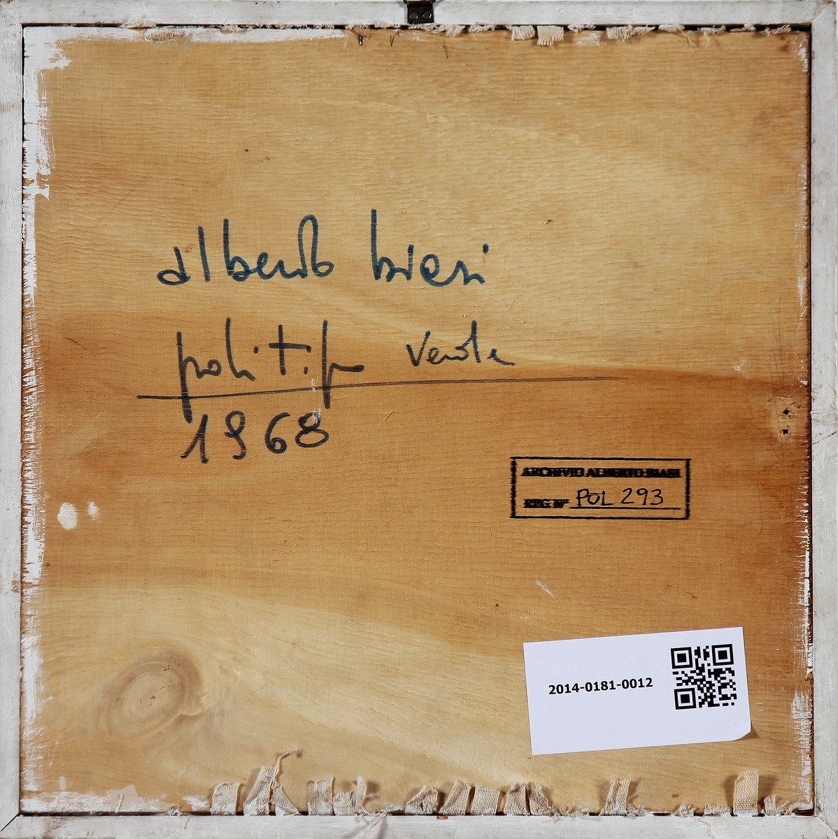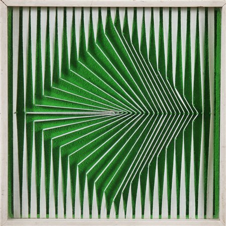 BIASI ALBERTO (n. 1937) Politipo verde. 1968. Tecnica mista su tavola. Cm 25,50 x 25,50. Al retro firma titolo e anno. Opera archiviata presso l'archivio Alberto Biasi come da documentazione fotografica allegata all'opera riportante il relativo numero d'inventario. Cornice presente