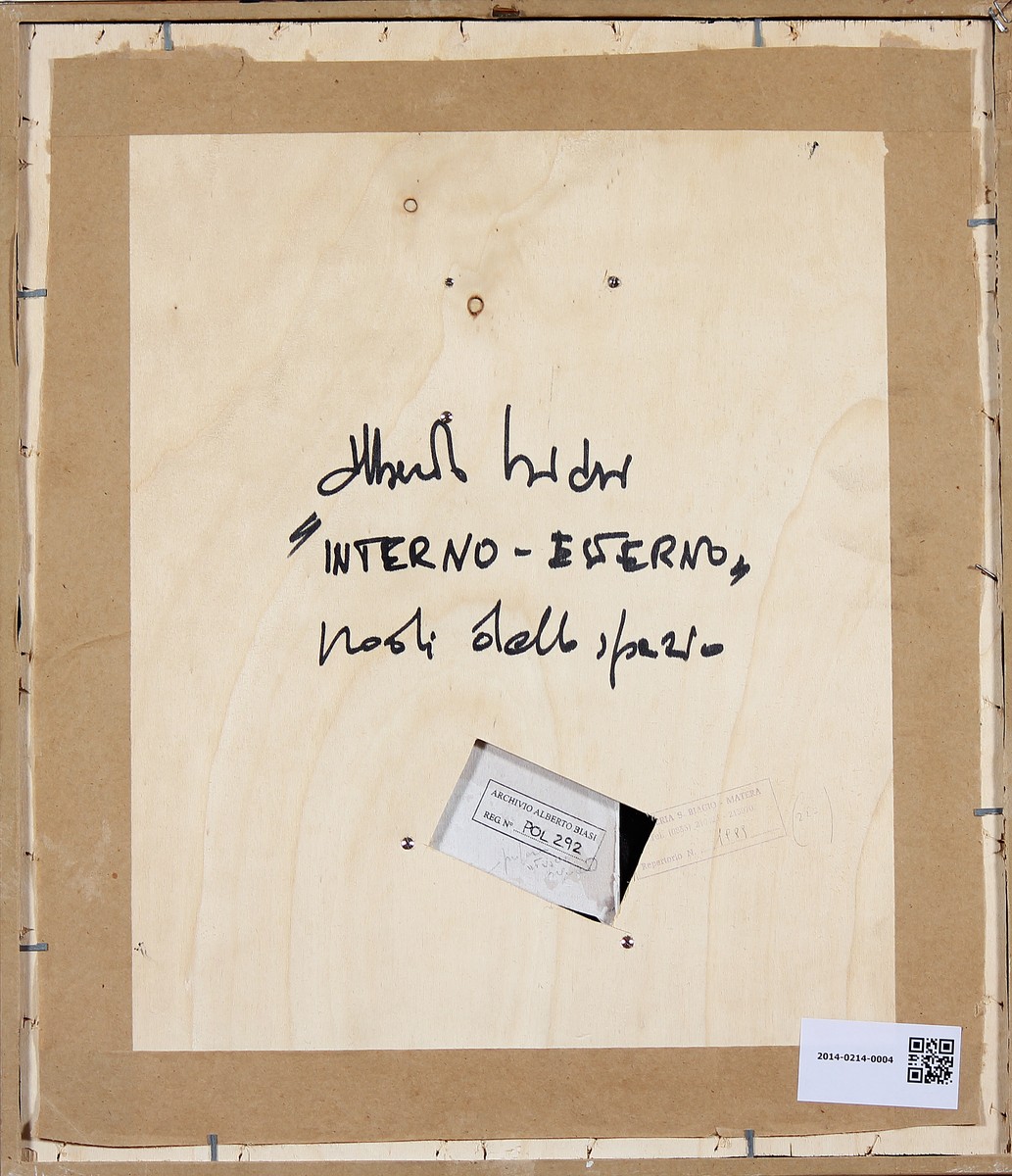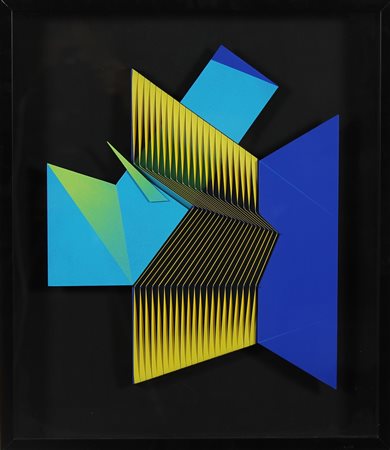 BIASI ALBERTO (n. 1937) Interno-esterno. 1975. Tecnica mista su tavola. Cm 33,50 x 40,00. Firma, anno e titolo al retro. Timbro galleria San Biagio, Matera. Opera archiviata presso l'archivio Alberto Biasi come da documentazione fotografica allegata all'opera riportante il relativo numero d'inventario. Cornice presente