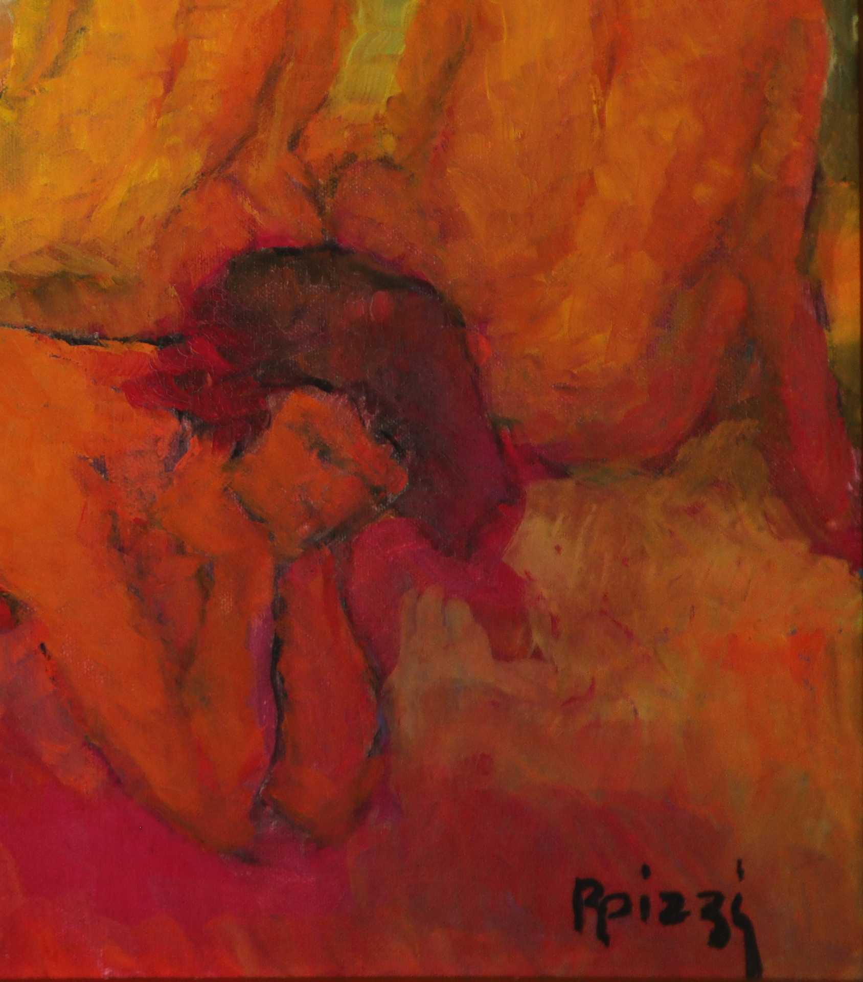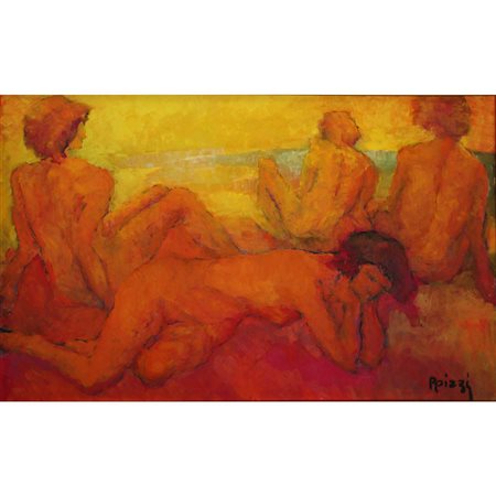 Renato Pizzi (San Severino Marche 1915-Macerata 1996) - Nudi sulla spiaggia cm 40X60 in cornice 64X85 Olio su tela Firma in basso a destra. Timbro della Galleria, firma e titolo sul retro.