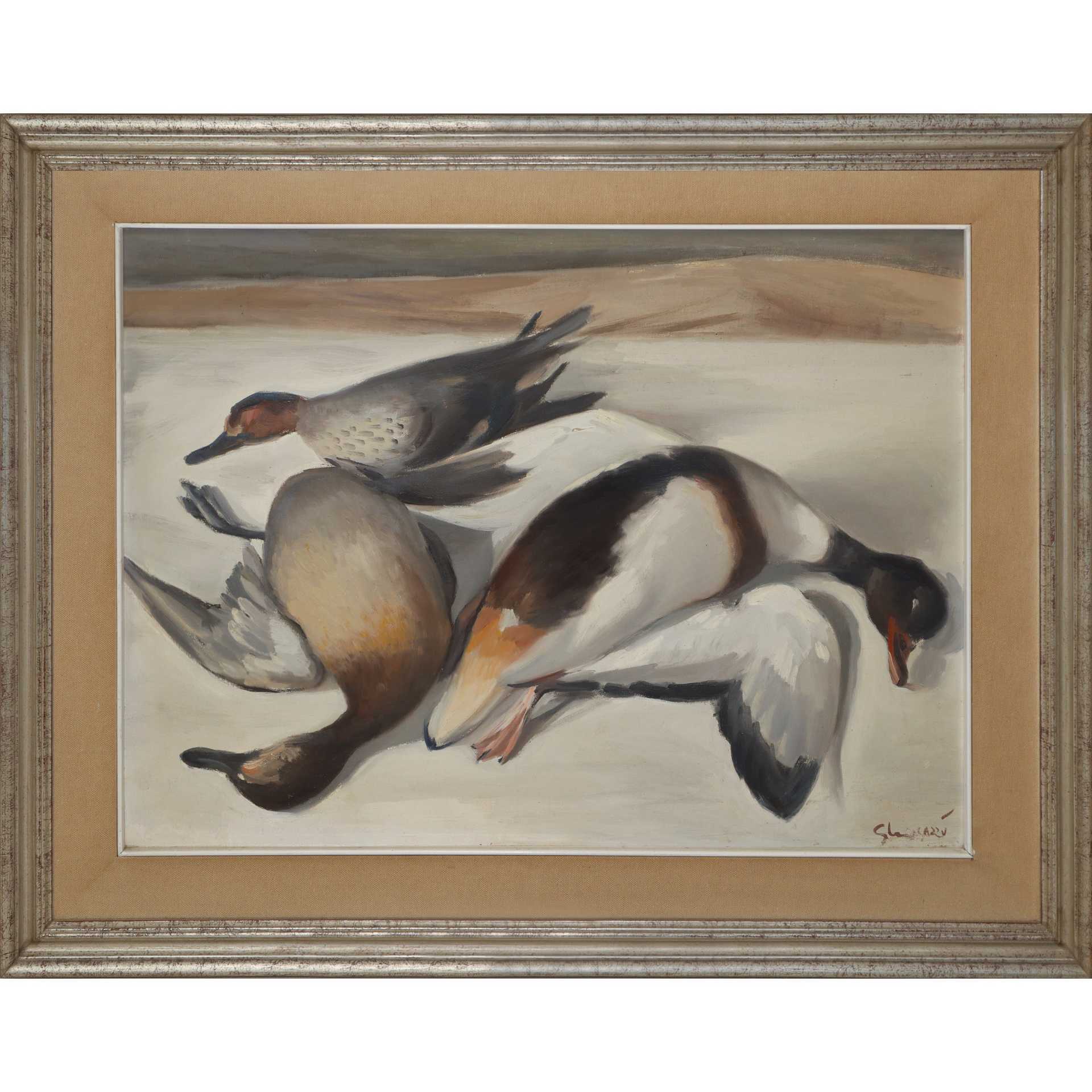 Gaetano Magazzù (Santa Margherita 1911-Messina 2011) - Natura morta con uccelli H cm 44.5x59.5 - in cornice H cm 61.5x76.5 Firmato Magazzù.Firmato Magazzù.