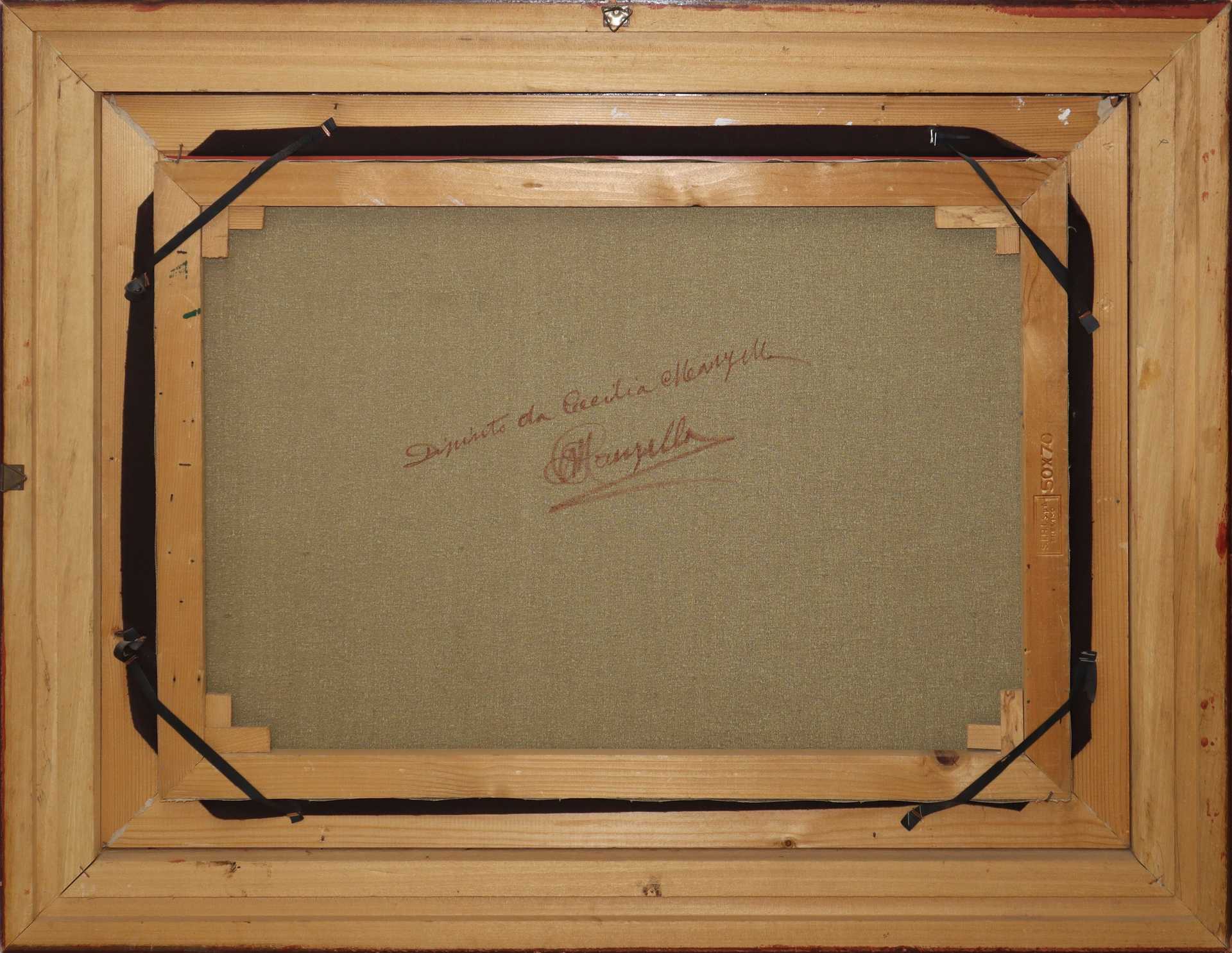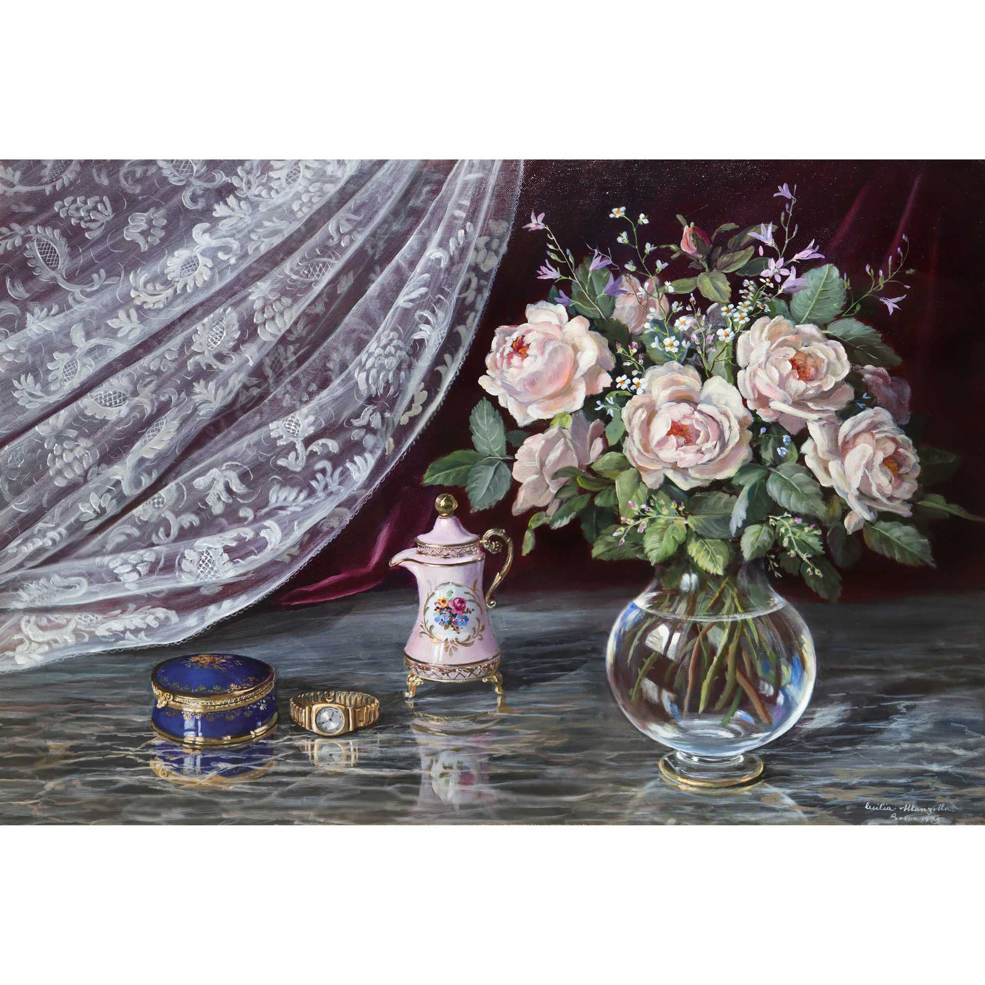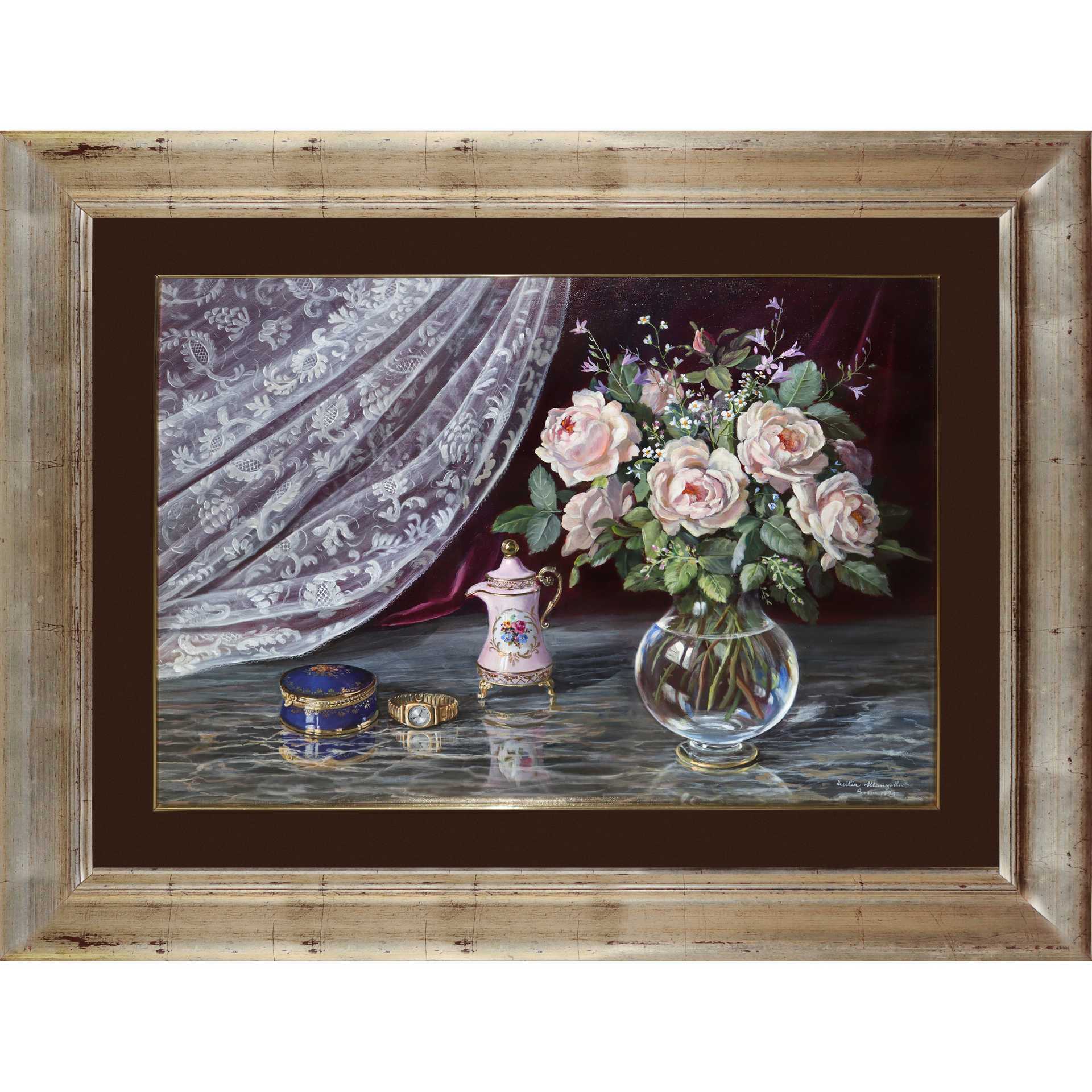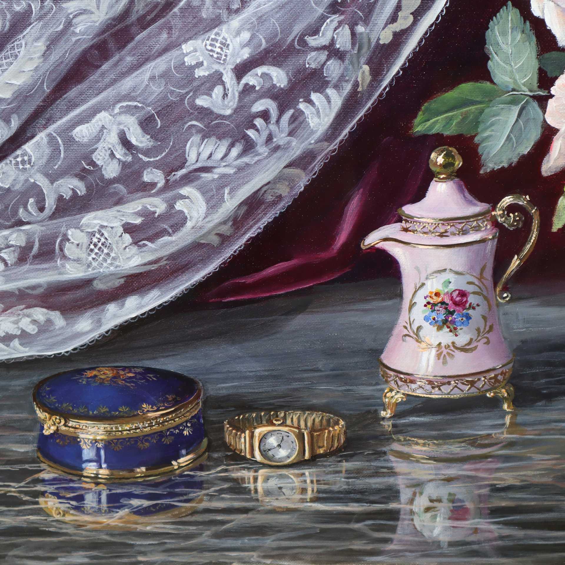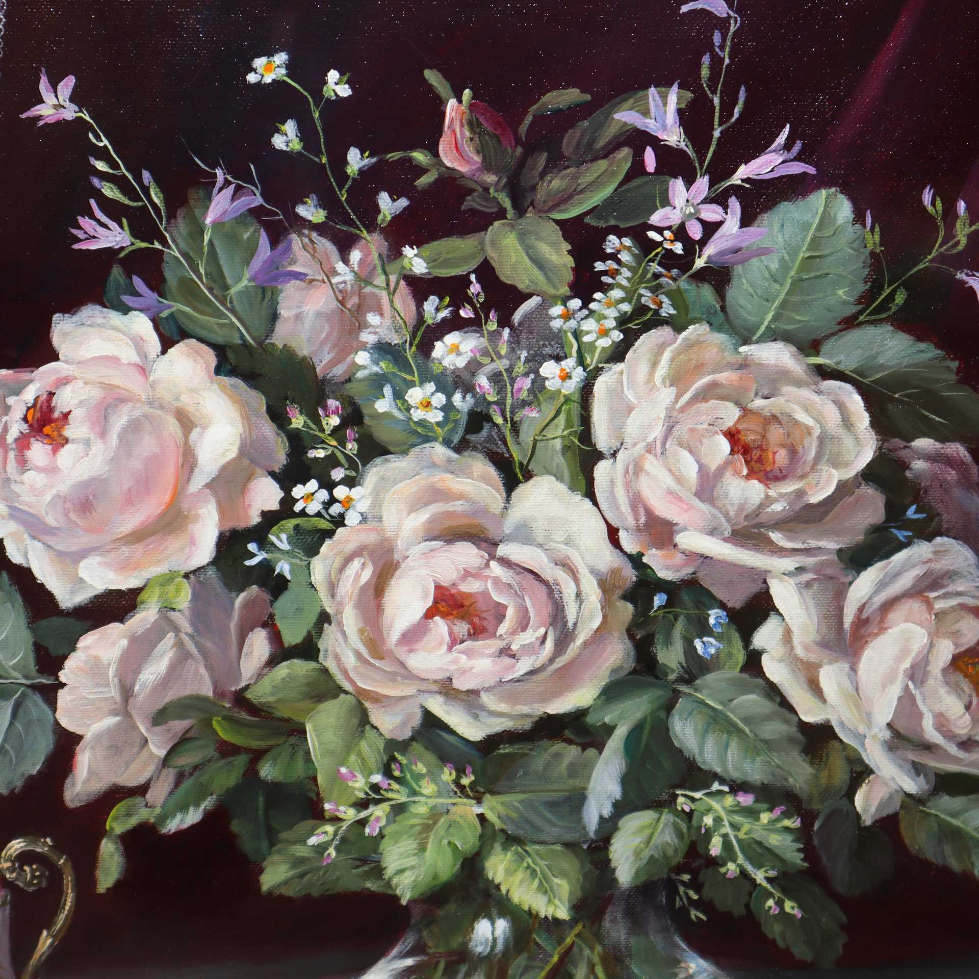 Vaso con fiori e tenda cm 50x70 in cornice cm 75x95 Olio su tela Firmato in basso a destra e al retro Cecilia Manzella