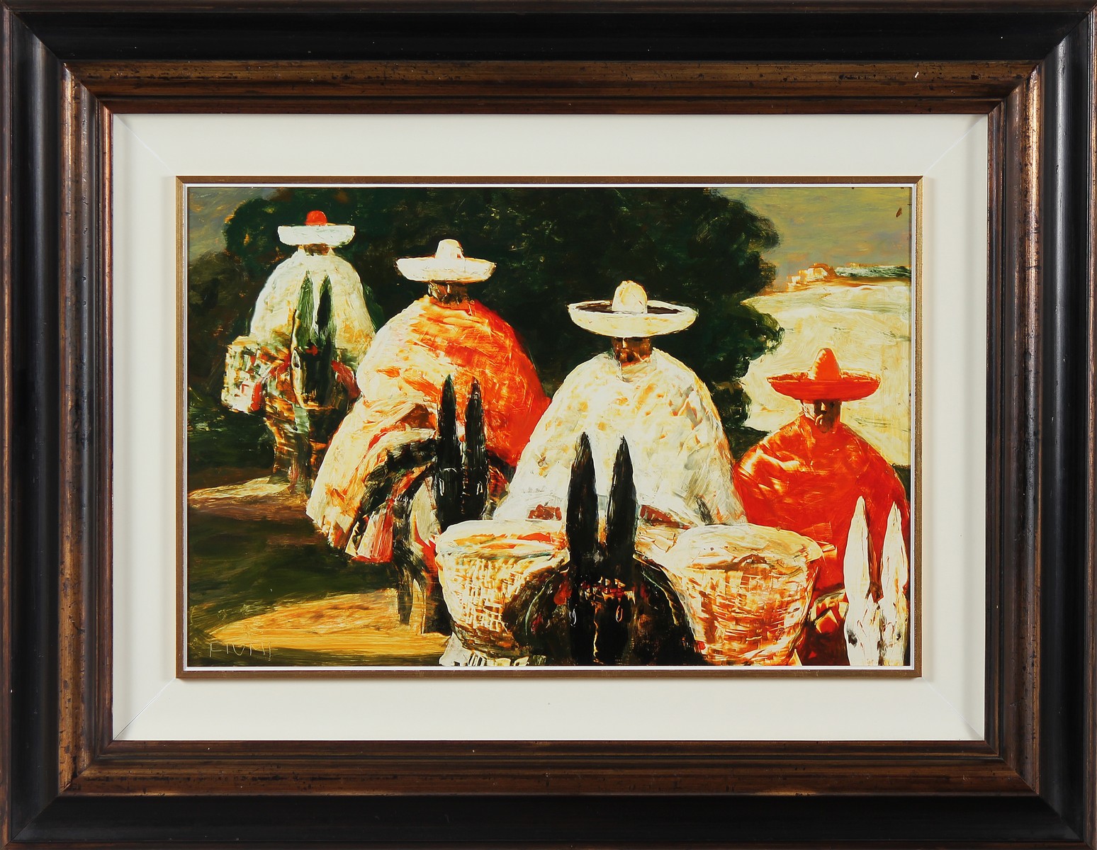 FIUME SALVATORE (1915 - 1997) Messicani. Acrilico su faesite. Cm 54,00 x 37,00. Autentica della Galleria la Cornice, autentica dell'artista su fotografia. Esposizioni: mostra personale dell'artista presso la Galleria La Cornice nel novembre 1978. Cornice presente