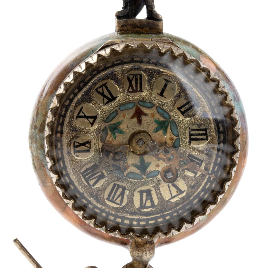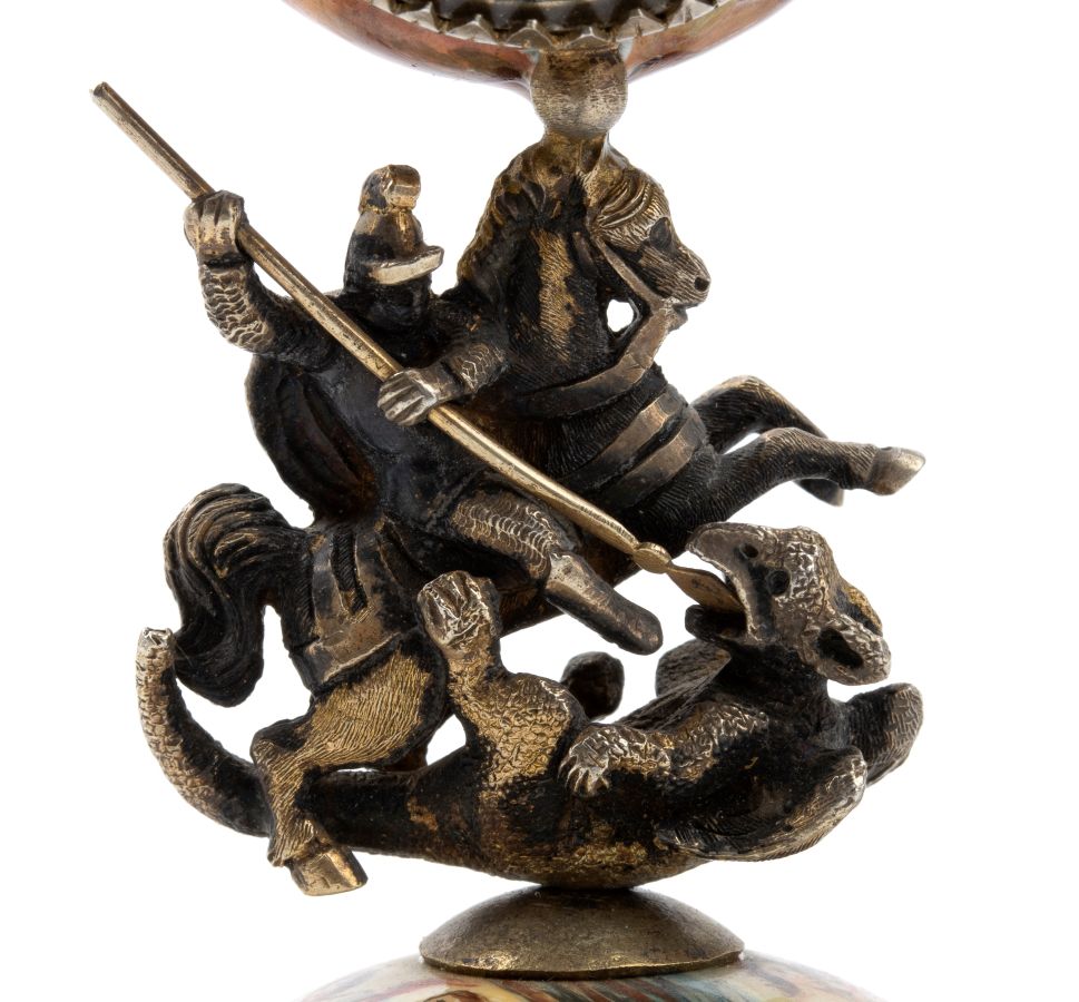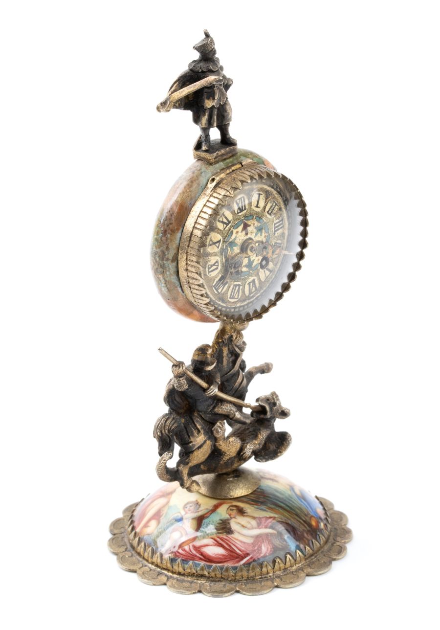Cassa in argento con base e corpo smaltati in policromia con scene mitologiche collegate dalla figura fusa di San Gorgio che trafigge il drago. Quadrante con smalti policromi, numeri romani, sfere nere e foro di carica allle ore '5. Movimento a conoide con carica a chiave.