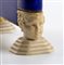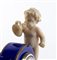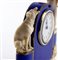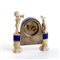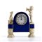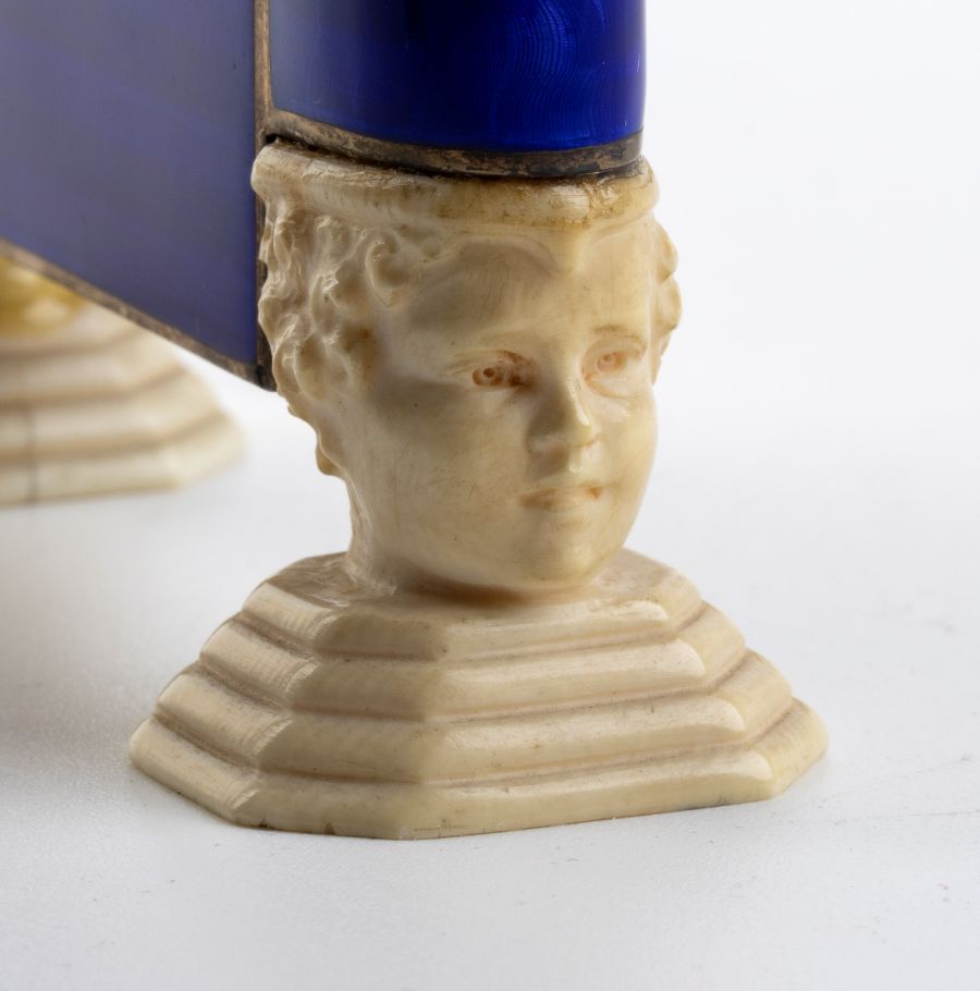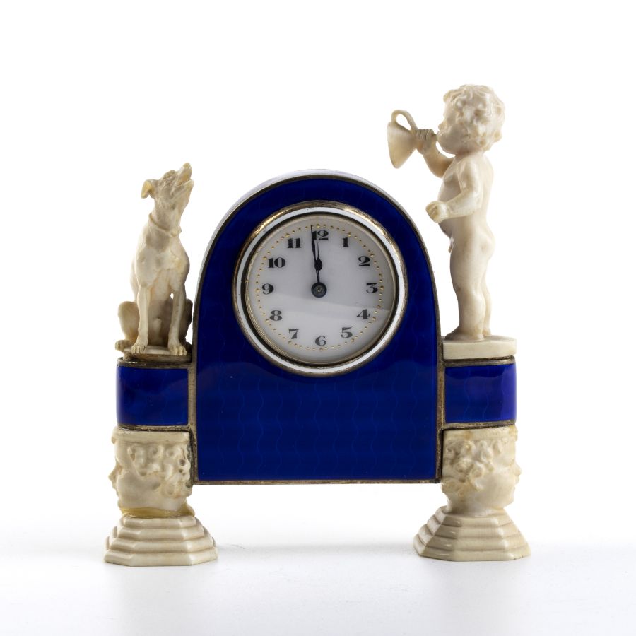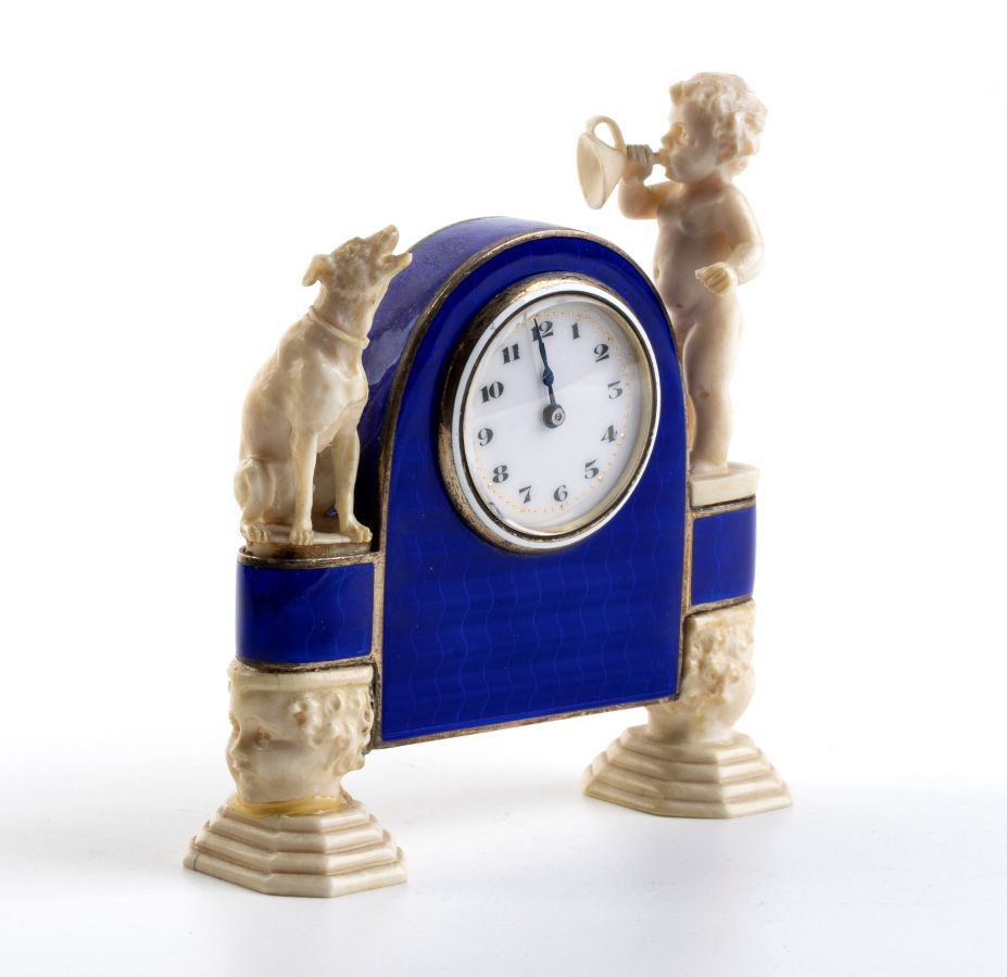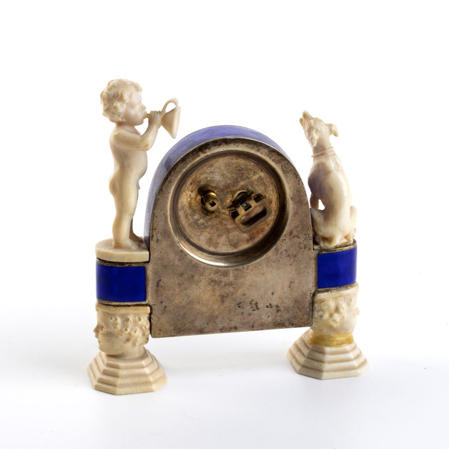 Anni '20 - '30 Cassa in argento di forma stondata in smalto blu guilloché poggiante su due sculture laterali in avorio di elefante (Elephas maximus Linnaeus, 1758 or Loxodonta africana Blumenbach, 1797) raffiguranti un putto musicante ed un cane; orologio con quadrante in smalto bianco e numeri arabi.