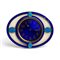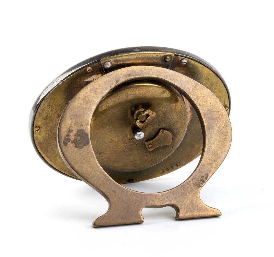 cassa di forma ovale in argento e ottone decorata in avorio di elefante (Elephas maximus Linnaeus, 1758 or Loxodonta africana Blumenbach, 1797) e smalti guilloché nei toni del blu; quadrante in smalto blu con numeri arabi e sfere luminescenti con iscrizione "Finningans - 8 Days - France".