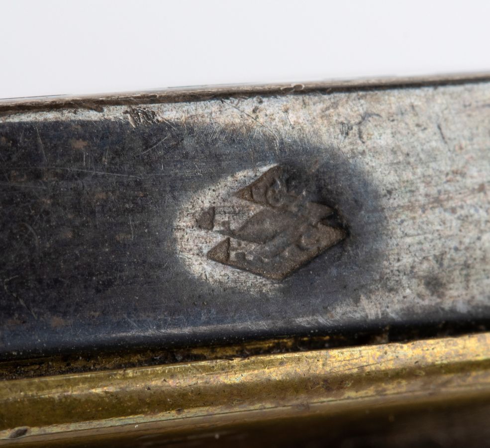 Cassa punzonata con i marchi per l'argento al titolo minimo di 800/1000 in uso dal 1838, cassaio "A G" non identificato.