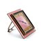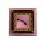 Cassa quadrata in metallo dorato con smalti guilloché nei toni del rosa, quadrante con lunetta dorata, numeri romani e sfere nere.