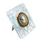 Cassa rettangolare in vetro opalescente con coppie di inseperabili firmato "'R. LALIQUE" e "France N° 760". Quadrante circolare con lunetta dorata e numeri arabi, sfere nere su paesaggio fluviale dipinto in policromia riportante le iscrizioni "8 Days - Swiss made".