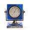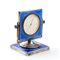 Cassa in argento 925/1000 con smalti guilloché nei toni del blu poggiante su basamento basculante, quadrante bianco con numeri arabi e sfere dorate riportante le iscrizioni "8 Days - Swiss made".