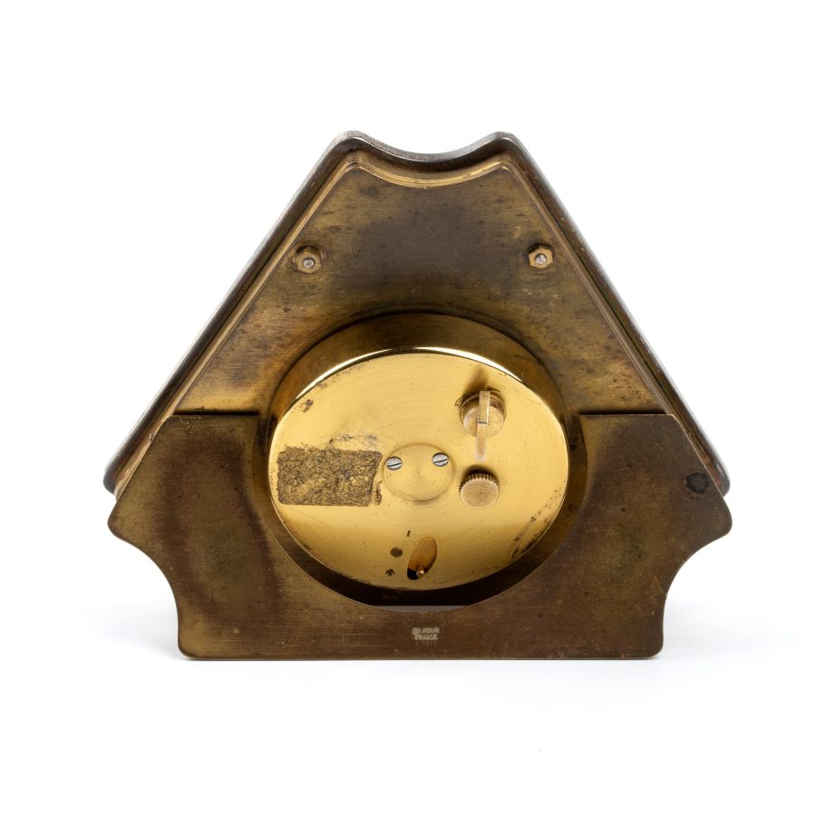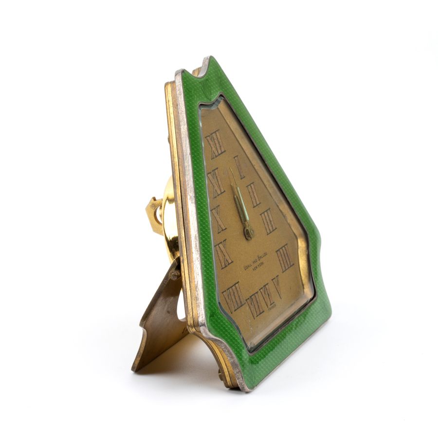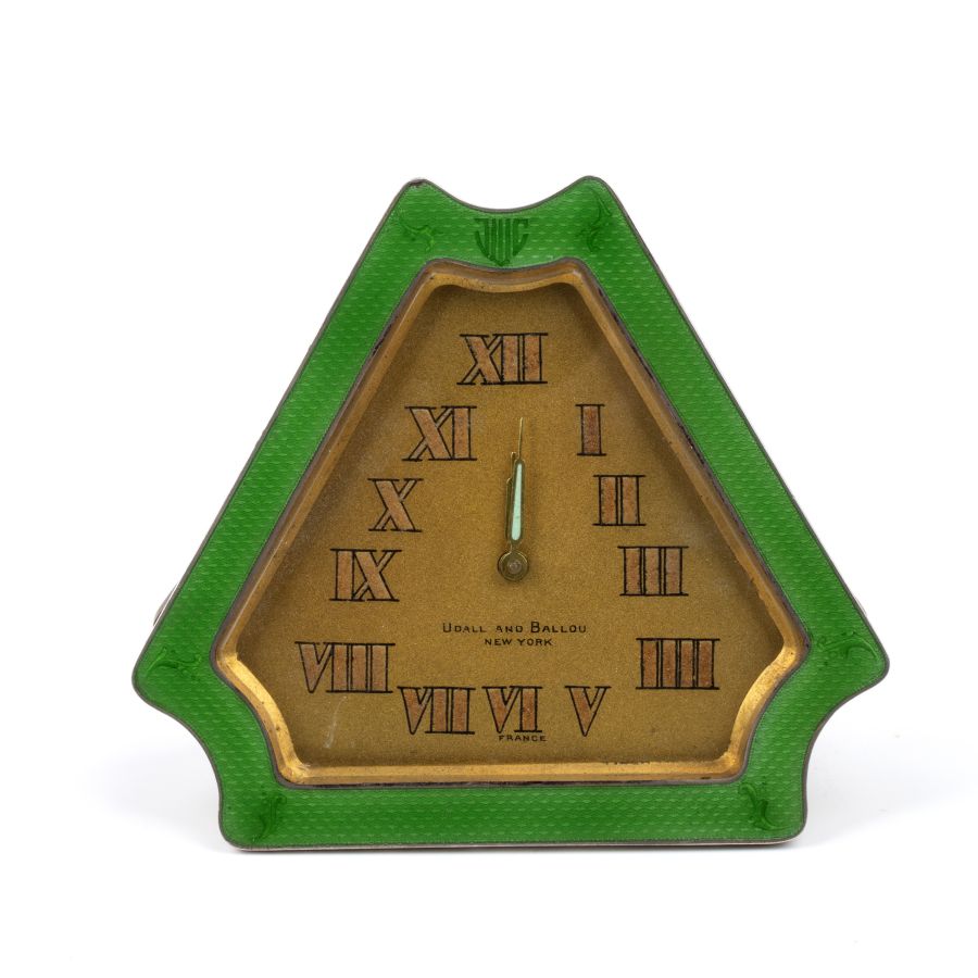 Cassa in ottone con cornice in smalto verde guillochè nei toni del verde, di forma triangolare, quadrante dorato con numeri romani riportante le iscrizioni 'UDALL AND BALLOU - NEW YORK - FRANCE'. Sull'esterno piede 'CH.HOUR - FRANCE'. Sul cavalletto: "129 - Déposé' e "CH. Hour France".