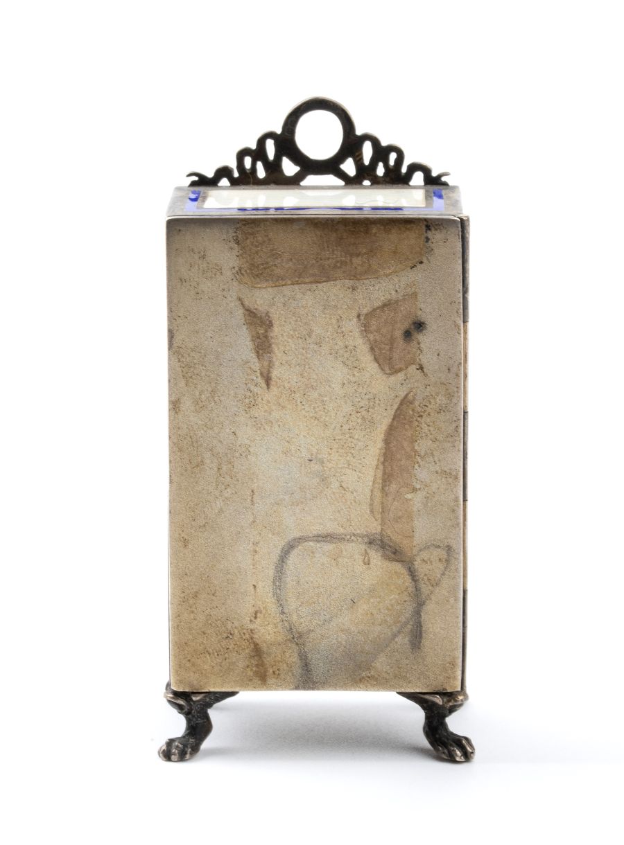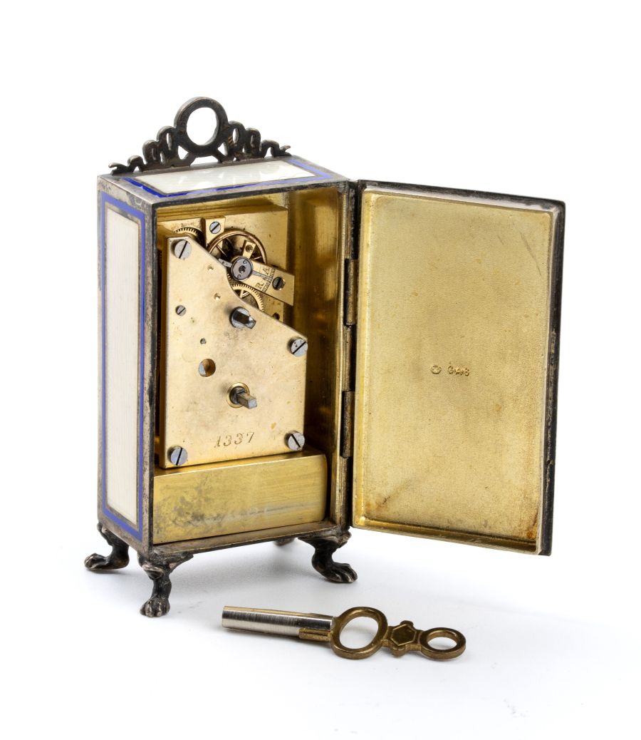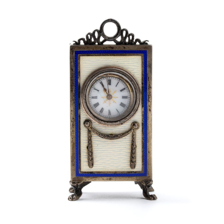 Cassa di forma rettangolare in argento 800/1000 con smalti guilloché nei toni del panna con cornici blu, quadrante in smalto bianco con numeri romani e sfere nere. Rimessa delle ore e carica a chiave.