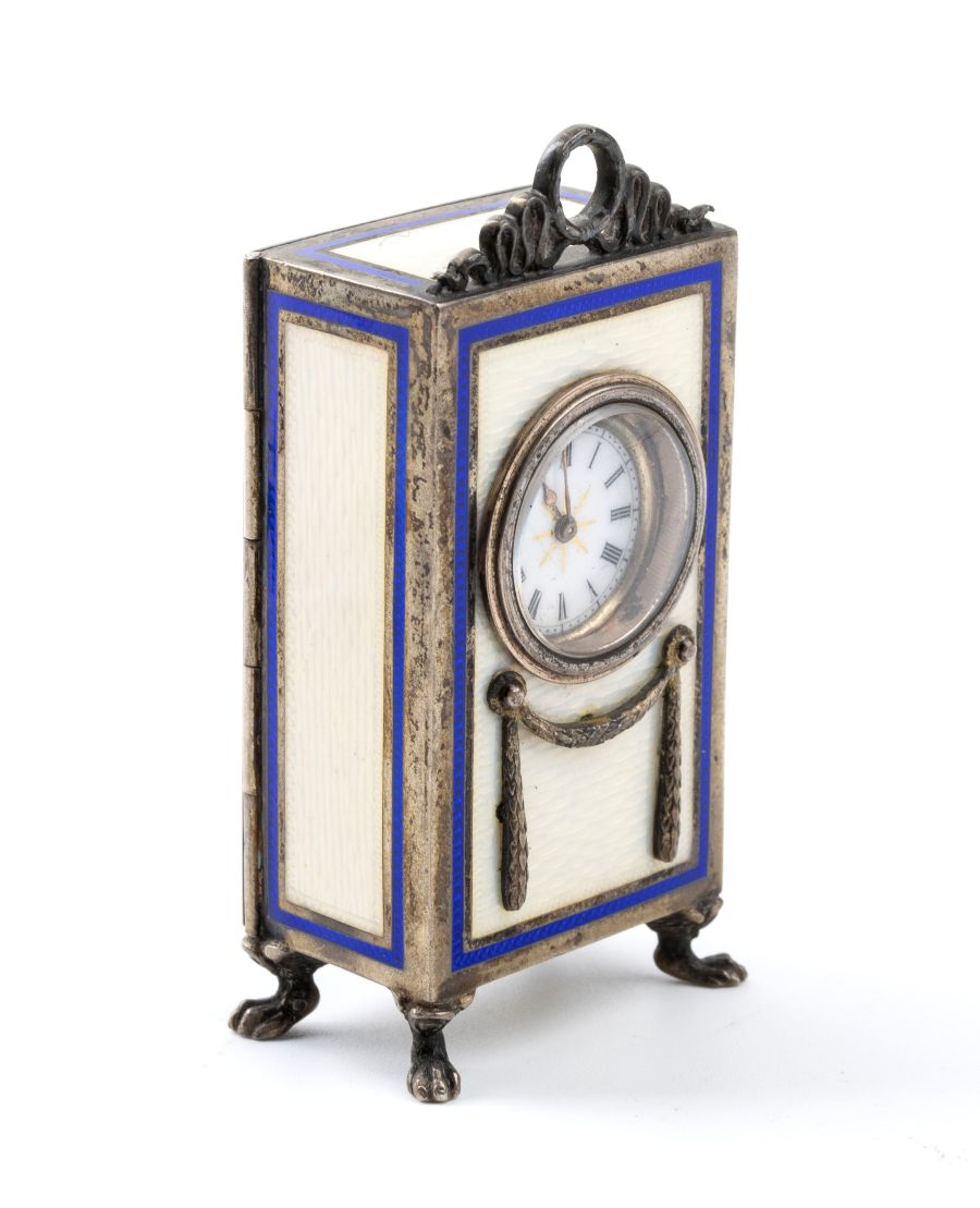 Orologio da tavolo Art Déco in argento e smalti. Vienna, Austria Ungheria, 1872-1922