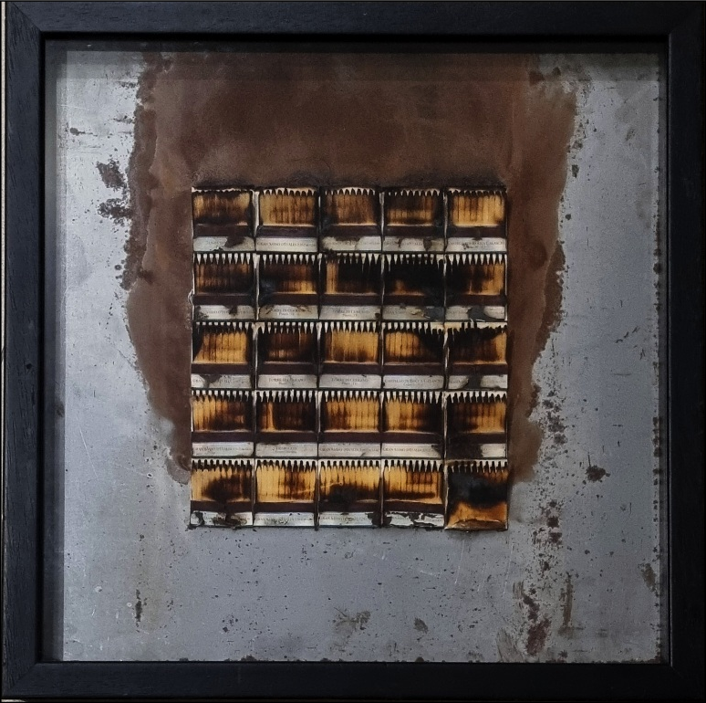 AUBERTIN BERNARD Francia 1934 - Germania 2015 "Dessin de feu" Fiammiferi bruciati su metallo cm 50x50, del 2009. Esemplare unico. Sul retro firma, data e numero d'archivio. Archivio a cura dell'Archivio opere Bernard Aubertin.