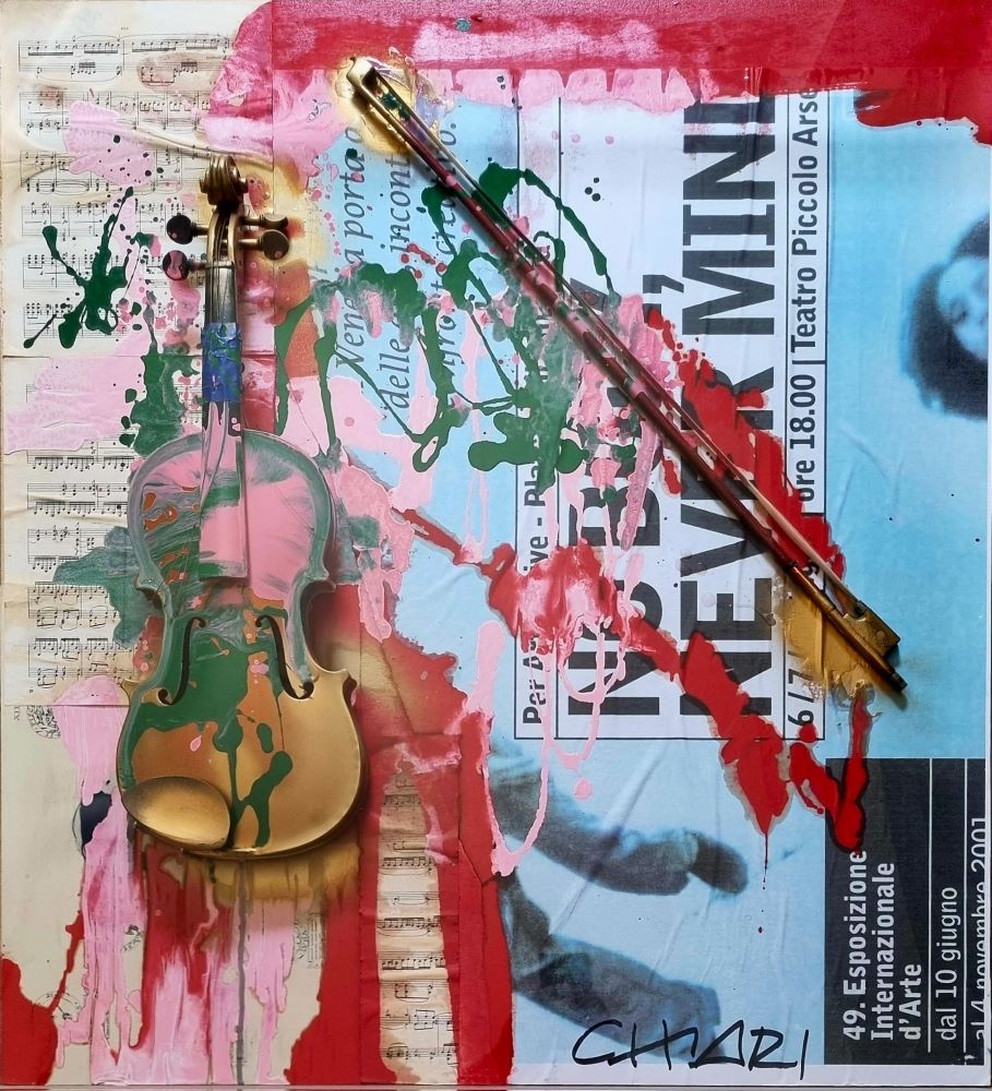 CHIARI GIUSEPPE Firenze 1926 - 2007 "Senza titolo" Tecnica mista ed applicazione di violino su tavola cm 80x90, del 2000. Firmata sul fronte in basso a destra. Contenuta in teca di plexiglass. Autentica su foto a cura del Maestro, certificato di garanzia a cura di Artetivù e certificato di autenticità a cura di Vimarte. Opera pubblicata sul catalogo "Chiari" a cura di AA.VV., a pag. 181.