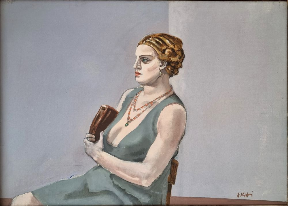 SUGHI ALBERTO Cesena 1928 - Bologna 2012 "L'attesa" Olio e tecnica mista su tela cm 70x50 del 1976/77. Firmato sul fronte in basso a destra, intitolato al verso. Autentica su foto a cura della Galleria L'Immagine (Arezzo).