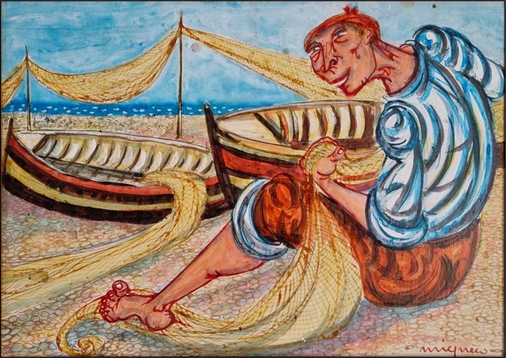 MIGNECO GIUSEPPE Messina 1903 - Milano 1997 "Pescatore" Tecnica mista su carta intelata cm 42x30, del 1980. Firmata sul fronte in basso a destra. Sul retro timbro dell'Archivio Generale con numero di archiviazione. Archivio su foto a cura dell'Archivio Generale Giuseppe Migneco.