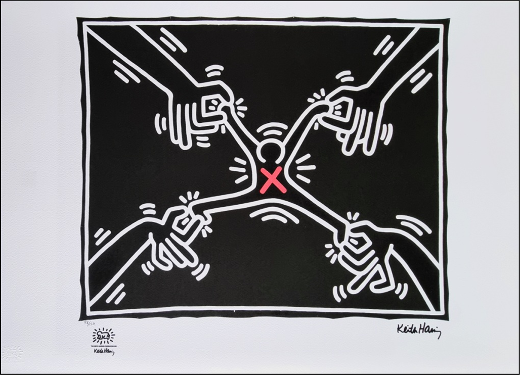 HARING KEITH Pennsylvania 1958 - New York 1990 "Senza titolo" Riproduzione litografica offset cm 70x50. Firma in stampa sul fronte in basso a destra, tiratura 78/150, timbro a secco e timbro in stampa a sinistra.