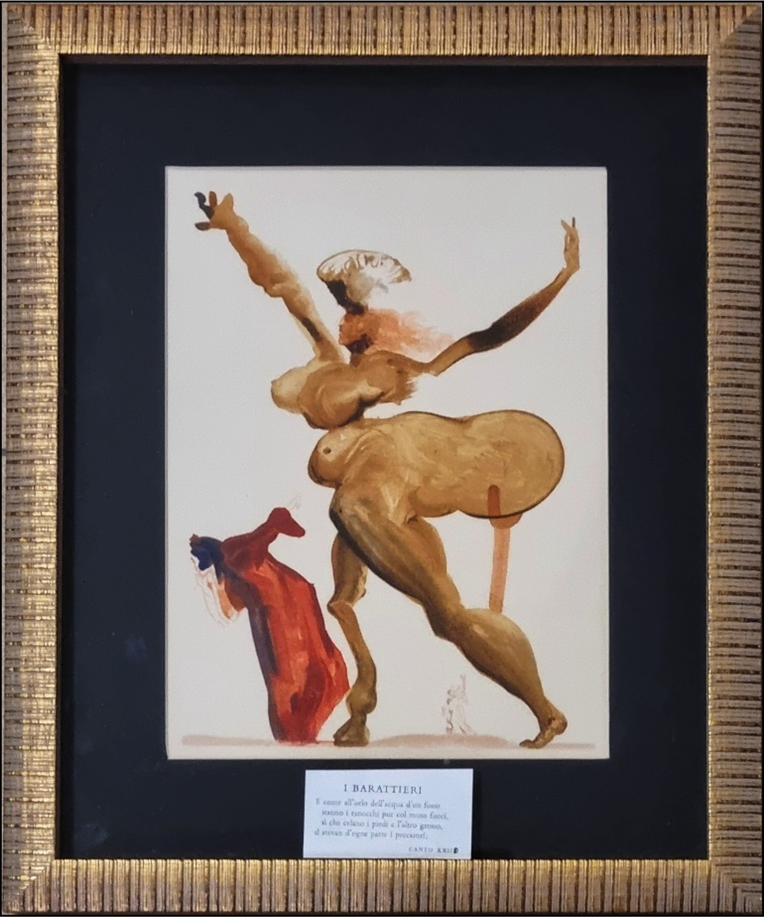 DALI' SALVADOR Spagna 1904 - 1989 "I barattieri" Xilografia su carta cm 21x27. Esemplare 1938/2900. Sul retro etichetta descrittiva a cura della Galleria Bottega D'arte (Matera). Tavole ispirate alla Divina Commedia. Opera incorniciata.