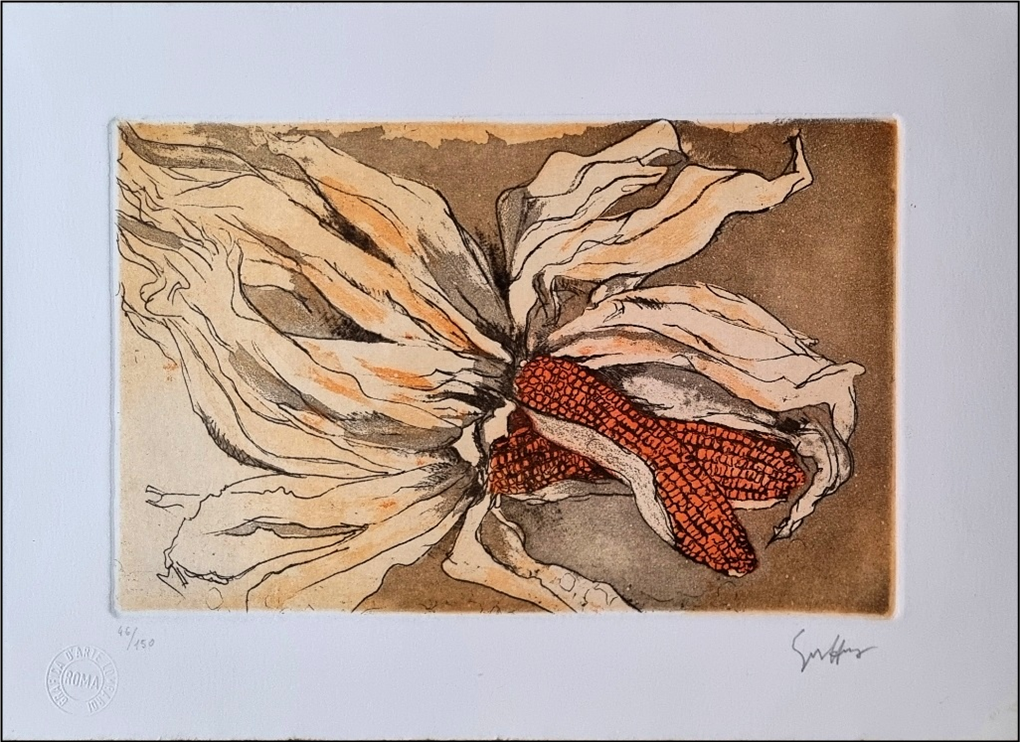 GUTTUSO RENATO Bagheria 1911 - Roma 1987 "Natura morta" Acquaforte acquatinta cm 35x24,5. Firmata sul fronte in basso a destra, tiratura 46/150 e timbro a secco a sinistra. Sul retro timbro di garanzia a cura della Grafica d'arte Lombardi e timbro "Franca May Edizioni".