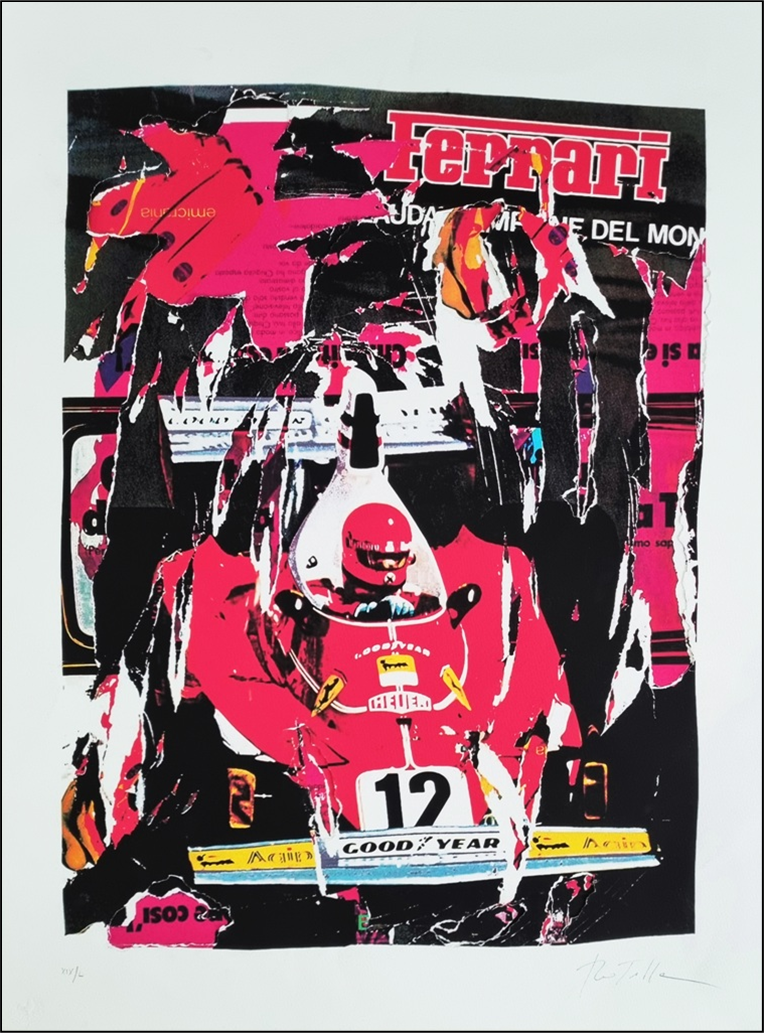 ROTELLA MIMMO Catanzaro 1918 - Milano 2006 "Ferrari" Multiplo decollage con strappi di manifesto applicati su cartoncino cm 67x90. Firmato sul fronte in basso a destra, tiratura e timbro a secco "Fondazione Rotella" a sinistra.