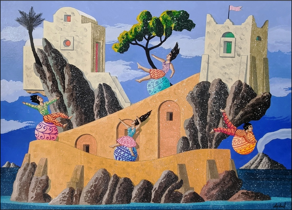 APHEL FABIO Cavalese (TN) 1957 "Lo scivolo a mare" Olio su tavola cm 70x50. Firmato sul fronte in basso a destra. Sul retro titolo, firma e dimensioni.