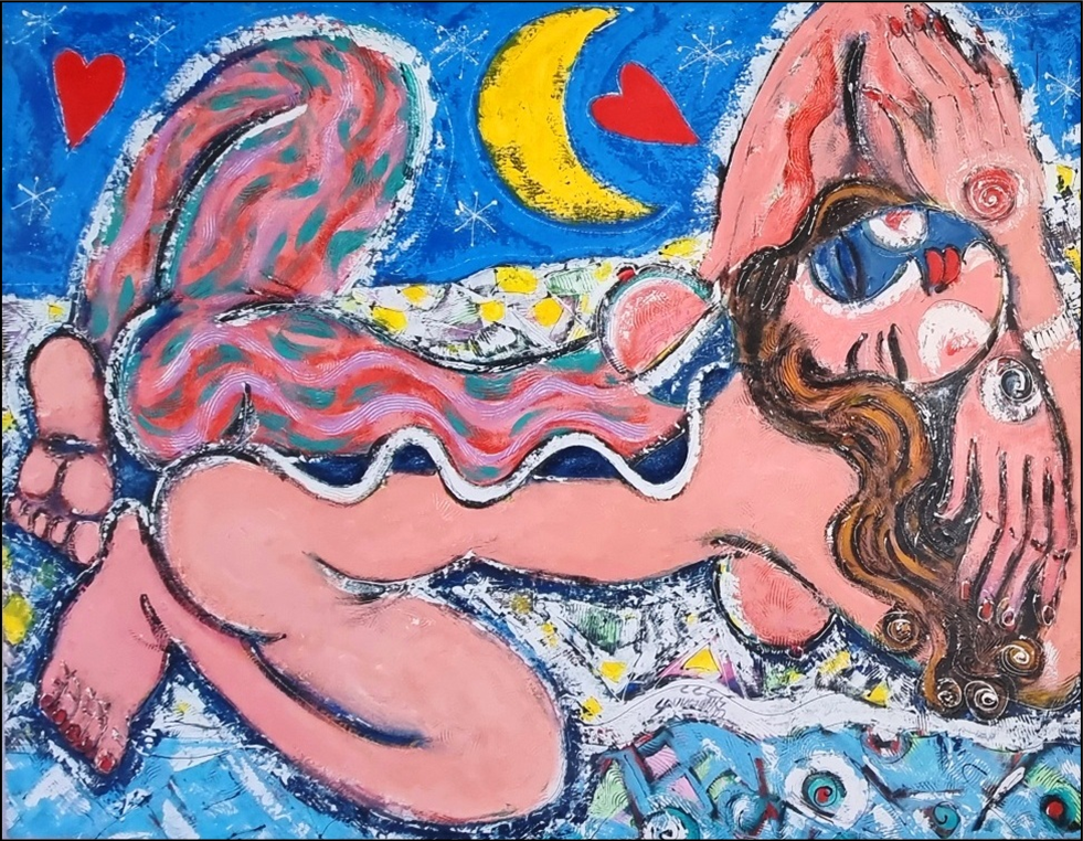 SQUICCIARINI ANTONIO Bari 1957 "La sognatrice" Acrilici e tecnica mista su tela cm 156x120, del 2005. Firmato sul fronte in basso al centro. Al verso titolo e firma per autentica. Autentica dell'Artista su foto.