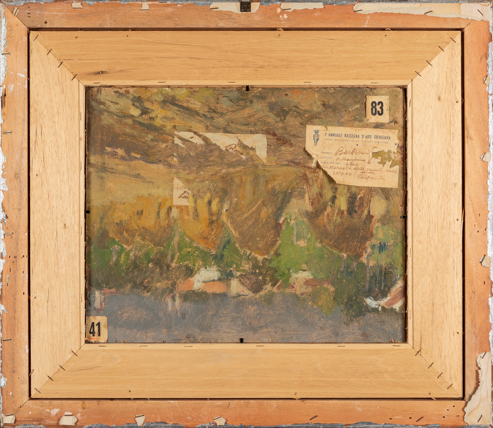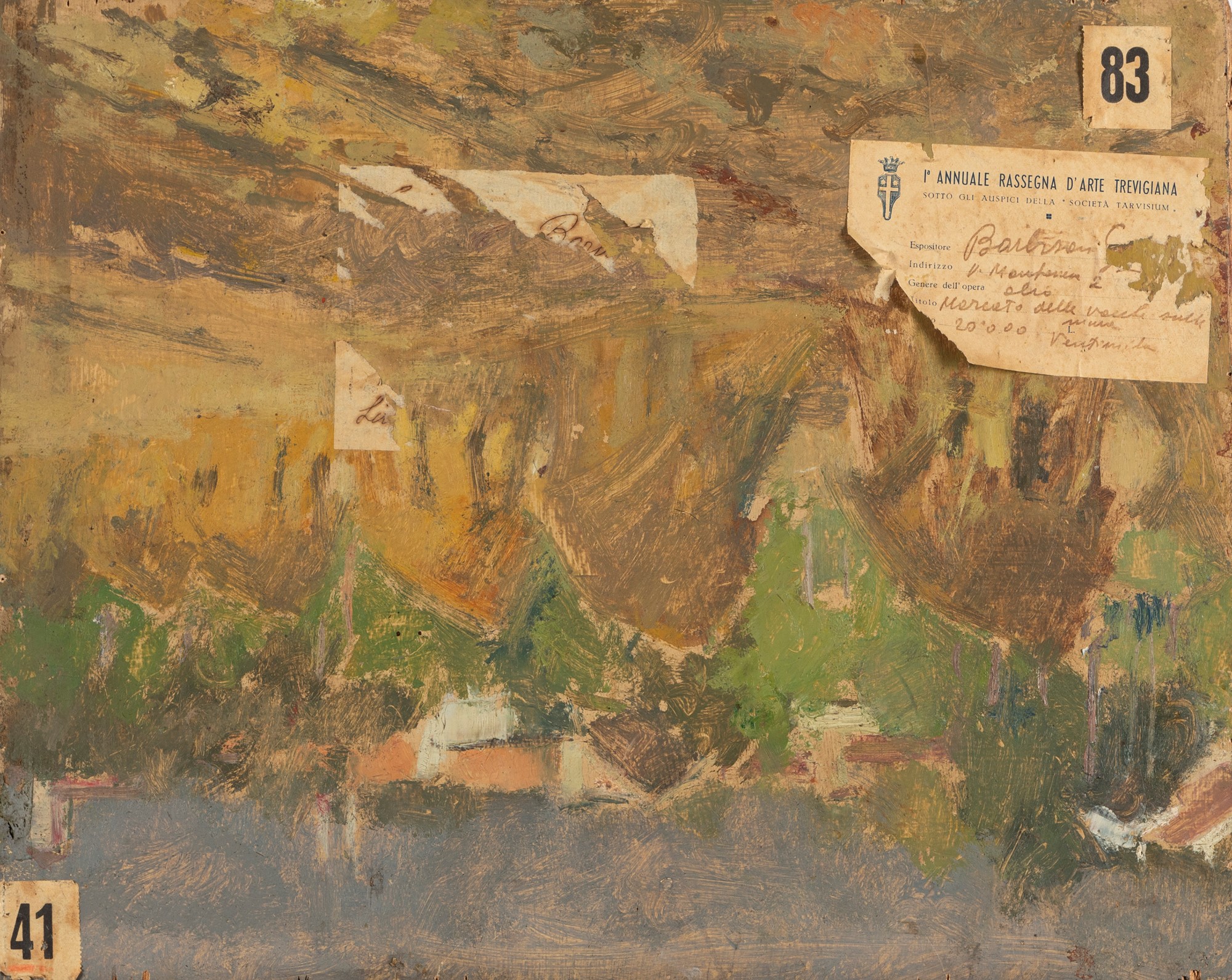 al retro, dipinto raffigurante Paesaggio con covoni, etichetta del pittore ed etichetta della Prima Annuale Rassegna d'Arte Trevigiana