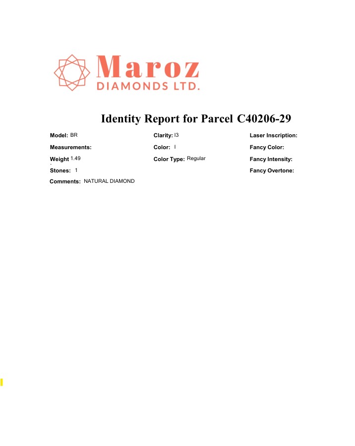 DIAMANTE 1,49 CARATI COLORE I - PUREZZA I3 - TAGLIO BRILLANTE - CERTIFICATO GEMMOLOGICO MAROZ DIAMONDS LTD MEMBRO ISRAEL DIAMOND EXCHANGE - C40206-29