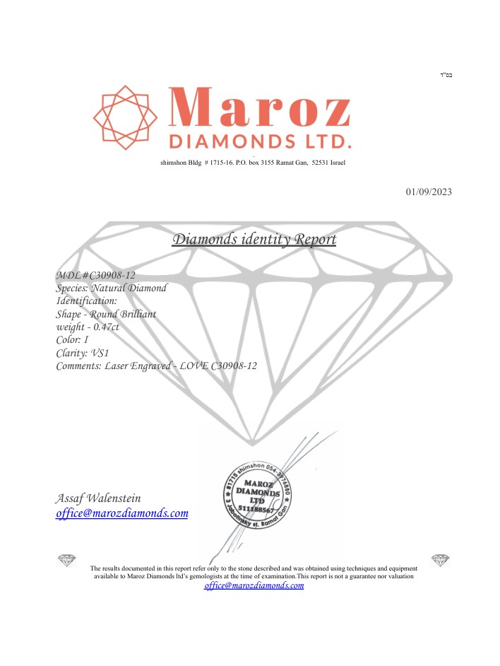 DIAMANTE 0,47 CARATI COLORE I - PUREZZA VS1 - TAGLIO BRILLANTE - PUREZZA INCISO AL LASER - CERTIFICATO GEMMOLOGICO MAROZ DIAMONDS LTD MEMBRO ISRAEL DIAMOND EXCHANGE - C30908-12-LC